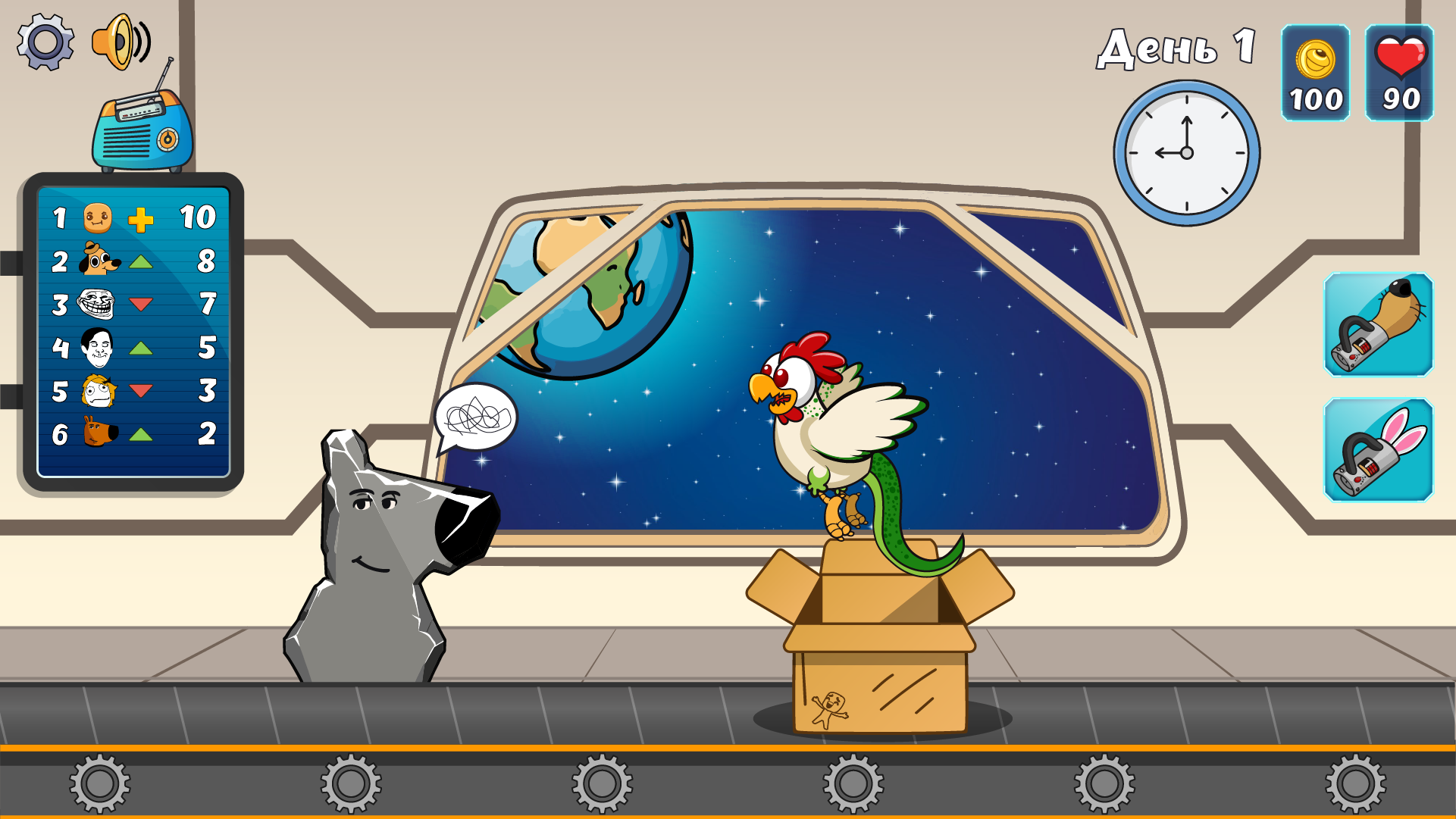 Механики с изучением коробок с помощью приборов "Дружок-XL" - определяет запахи в коробке, "Ухо-3000" - определяет звуки - так же съели около-4-5 часов (Приборы рисовал я сам из своей головы, а потом уже отдавал художнице на правку)