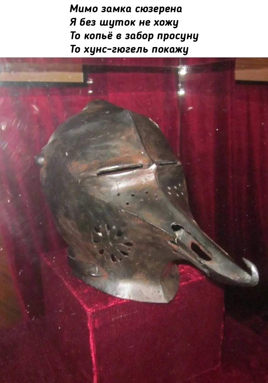 "Хундсгугель" - это разновидность шлема типа бацинет с сильно вытянутым вперёд конусовидным забралом, отдалённо напоминающим вытянутую собачью морду. Такая форма забрала увеличивала площадь его поверхности, что позволяло снабдить его множеством вентиляционных отверстий. Это значительно облегчало дыхание воина. Такие отверстия обычно располагались лишь на правой стороне шлема, поскольку в конном бою на копьях подвергалась опасности в первую очередь левая половина головы. Коническая форма и гладкость левой части забрала помогала наконечнику вражеского копья соскользнуть даже при мощном ударе.