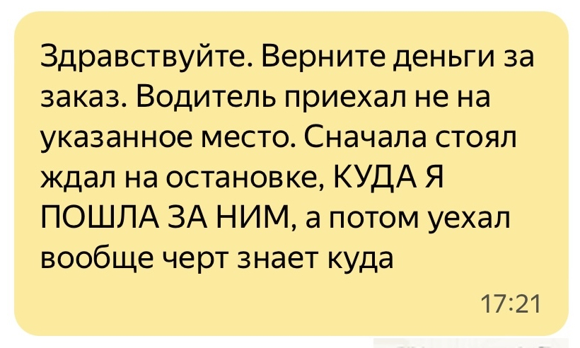 Вызываю такси. Всегда, когда жду, отслеживаю движения водителя по карте. Водитель приехал, включил бесплатное ожидание, только стал он метров за 15 до назначенного места. Подумала - ну ладно, пройду, небольшое расстояние. Начинаю движение, прохожу примерно половину пути, водитель тоже начинает движение. Подумала, что он увидел меня и решил поближе подъехать (наивная!). Проезжает мимо («значит едет в назначенное место» думаю я), разворачиваюсь, иду обратно.