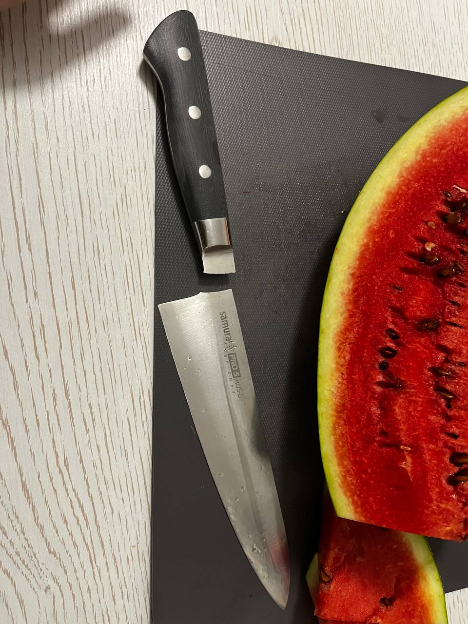 Когда режешь арбуз, сначала вонзаешь нож в корку, потом корка режется легко, и нож ударяется о стол. В тот момент, когда нож ударился о стол, он и раскололся. Но ИМХО, это не такая сильная ударная нагрузка, которую не должен выдерживать нож. Я не рубил ничего этим ножом, использовал только по назначению.