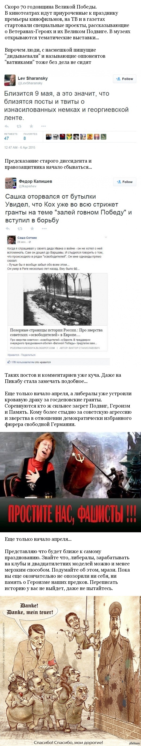 Мне вот интересно, придурки, вы зачем это делаете? Ладно там всякие Сотники, Кохи, Шендеровичи и Мальдон получают за это доллары. Но вы-то что с этого имеете? Или вы действительно получаете удовольствие, обливая помоями тех, кто сражался за вас? Там ведь и ваши деды были. Или ваши были по другую сторону фронта?