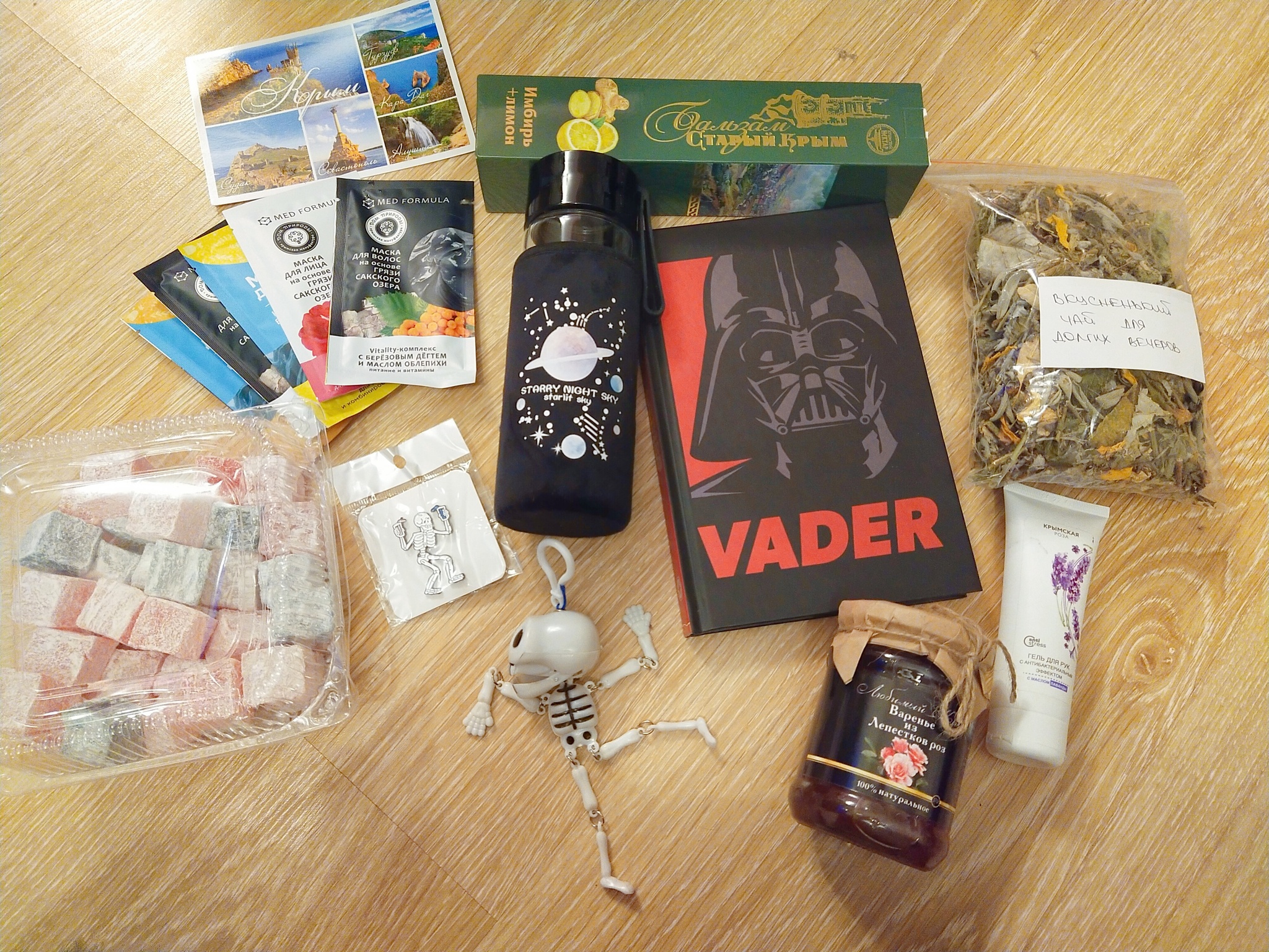 Вот общий вид подарка: бальзам Старый Крым (сначала подумала, что алкогольный, но нет, больше похоже на сироп), большой пакет травяного чая (возможно, собственной сборки, пушто этикетки нет), красивый ежедневник, полезные маски для морды лица и волос, стеклянная поилка в текстильном чехле (очень приятный на ощупь, как замша), значок со скелетиком (уже переселен на рюкзак), антибактериальный гель для рук (тоже пригодится, наверное)) и сладости! Рахат-лукум (или что это) очень вкусный, я его обычно редко ем, но тут прям насыщенный фруктовый вкус, нраица!