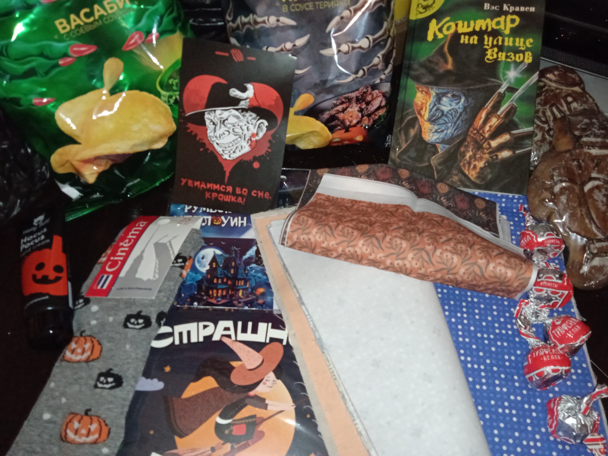 В итоге, пряников оказалось 2. Ещё были хэллоуинский крем для рук (мастхэв!), носочки с тыквами, шоколадки, очень красивый хэллоуинский мини румбокс, совершенно роскошные чипсы и 2 набора ткани для моего хобби.