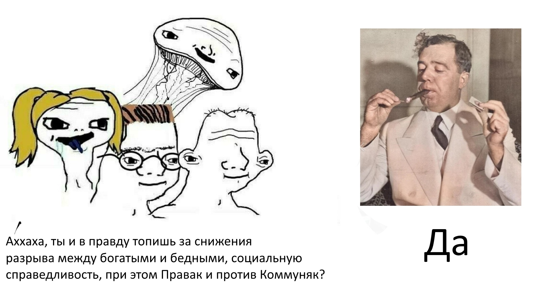 А теперь, как вы собираетесь прокормить остальных людей? Что же Морган, Барух, Рокфеллер и Меллон собираются делать со всей этой провизией? Они не могут сами съесть это, они не могут сами носить всю одежду, они не могут жить во всех домах.