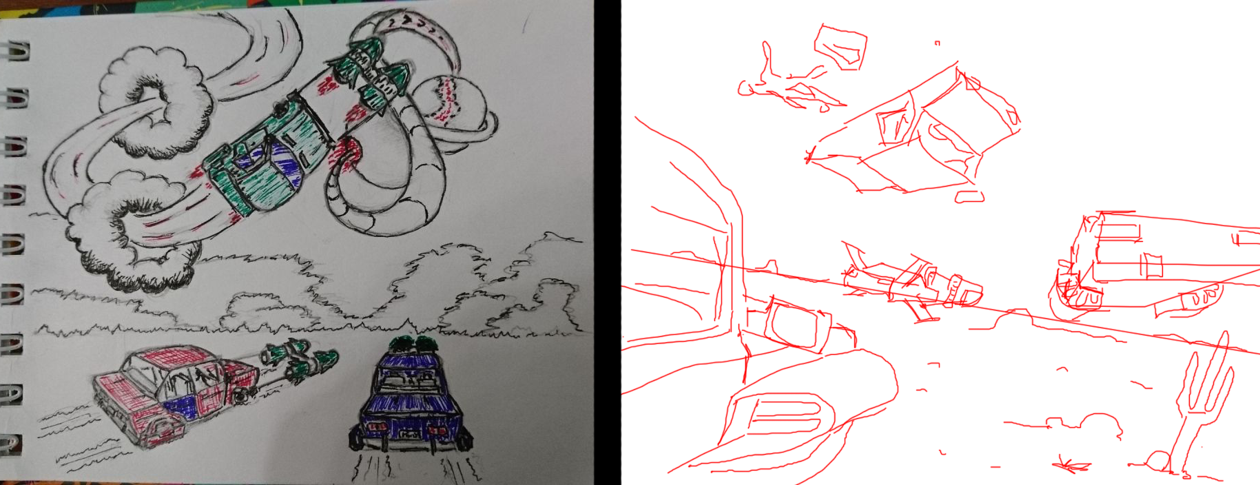 Из рекомендаций: Пробовать осваивать более культурное наложение штриха и цвета а также пробовать рисовать более сложные ракурсы, вот как пример я нарисовал примерно тот же сюжет. Только я наклонил горизонт и добавил тачку на передний план.