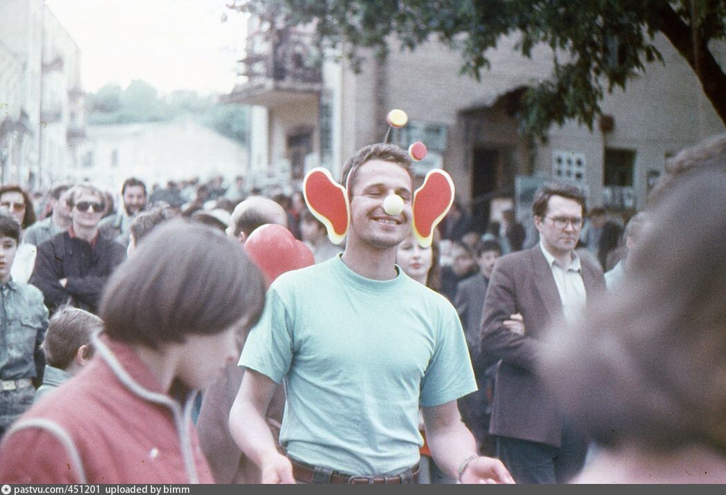 Площадь Октябрьской Революции в 1990 году, предпоследнее лето СССР. На домах видны плакаты в честь 45-летия Победы.
