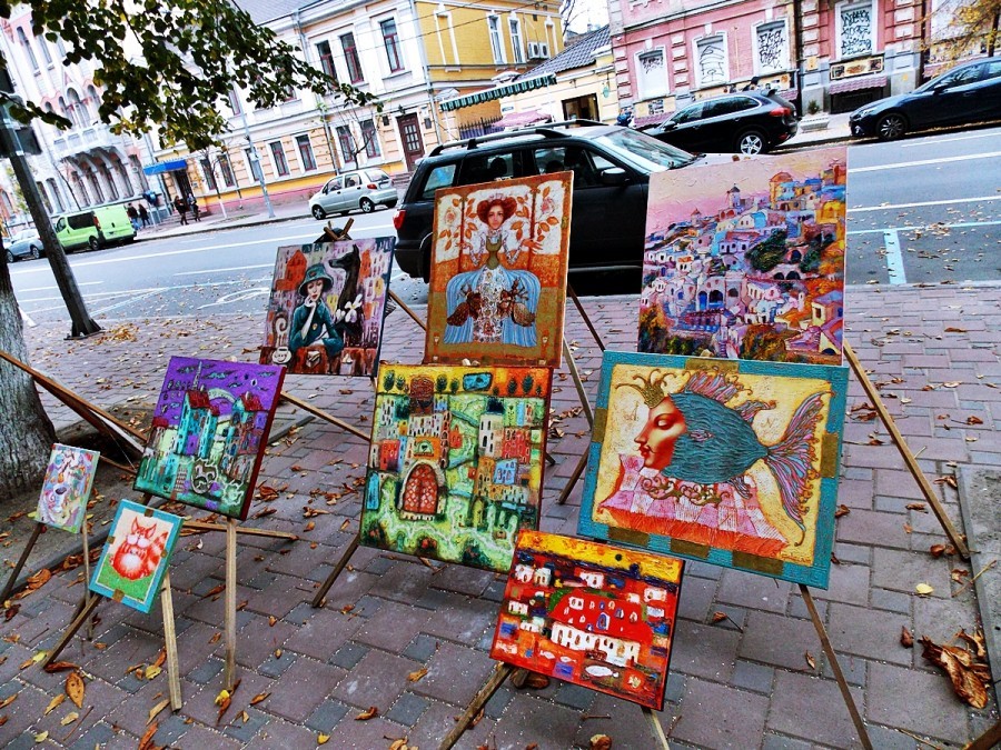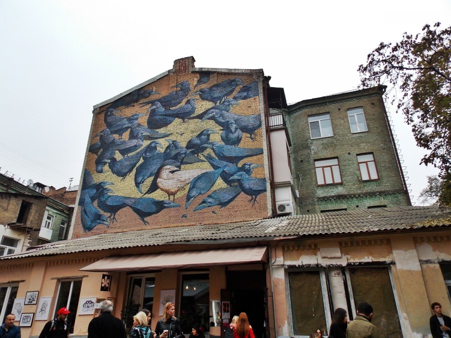 Воробышек остался после Революции Достоинства. На заднем фоне - мурал. Там фосфорические краски, он светится по ночам. Дети обводят мелом карту Киева - получается то ли монгол, то ли казак с чубом.