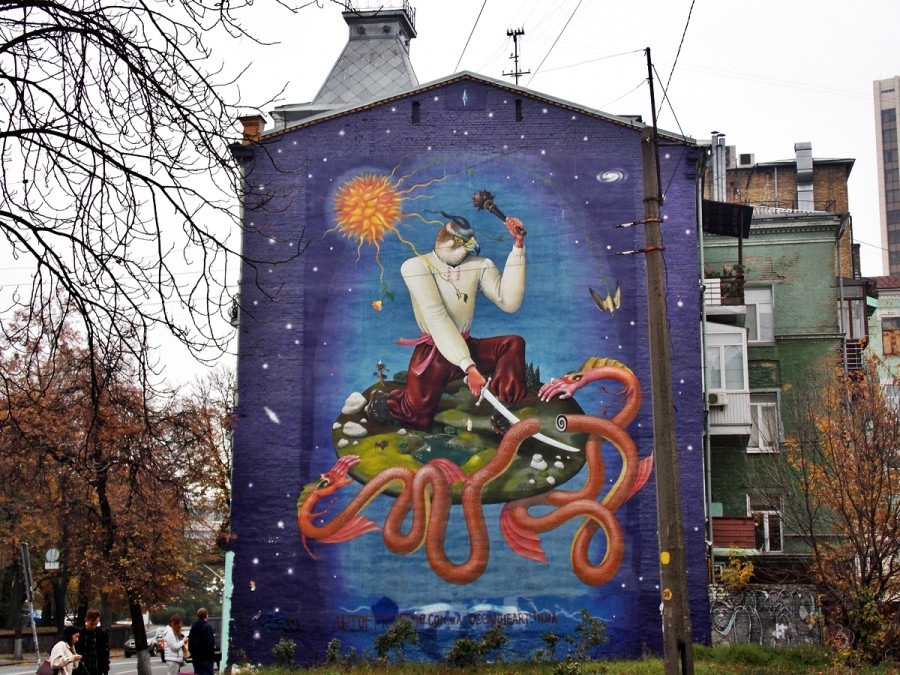 Мурал «Украинский Святой Георгий». Авторы – художники из арт-дуэта «Interesni Kazki» – Алексей Бордусов и Владимир Манжос. В центре композиции воин-казак с головой сокола, обрубающий кое-кому загребущие лапки, лезущие на нашу землю.