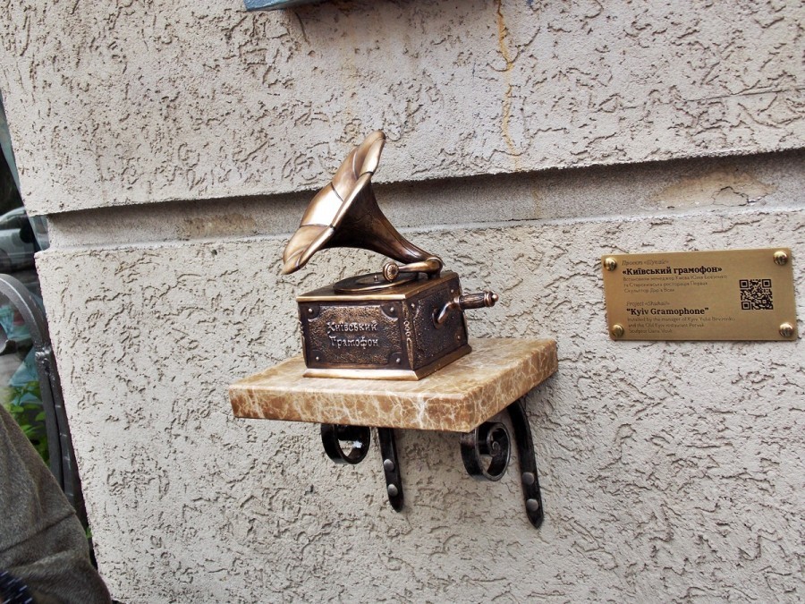 На Рогнединской 2 открытие десятой, юбилейной мини-скульптуры проекта "Шукай". Его начали в прошлом году, мне он очень нравится - в разных точках города устанавливаются бронзовые мини-скульптуры с символами Киева. На этот раз установили маленький граммофон, который играет гимн Киева "Як тебе не любити, Києве мій". Сбоку есть кнопочка.