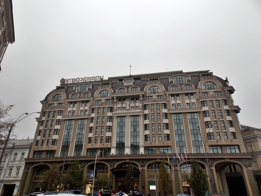 Это гостиница Интерконтиненталь, первая пятизвездочная в Киеве. Фасад украшает богиня Ника. Зум обнаруживает, что морда у богини ваще не богическая.