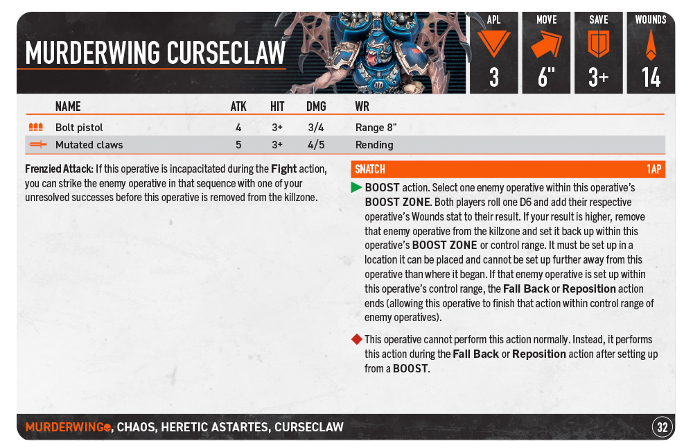 Ни один оперативник не олицетворяет собой садистскую радость, с которой «Крыло Убийц» сеет хаос, так, как Проклятый Коготь, который так любит хватать людей, что отрастил крылья и огромные руки, чтобы похищать несчастных на своём пути над головой. Возможность перемещать вражеских оперативников может открыть драматические возможности на более поздних этапах, и, честно говоря, это просто забавно, если взять и затащить одного из них под орбитальный удар. Классическая комедия Хаоса.