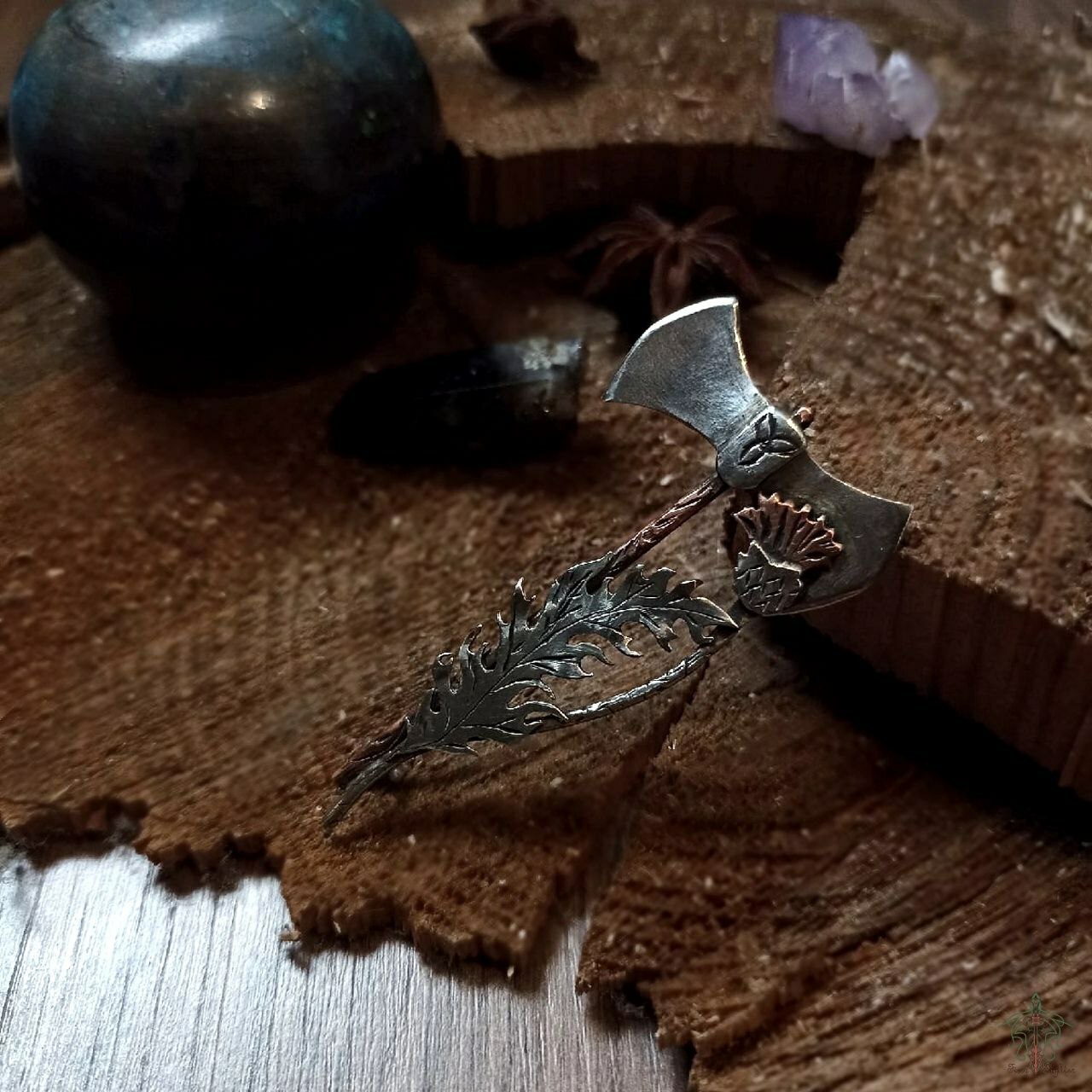 Брошь - килтпин из нейзильбера и меди. Выпиловка, гравировка, текстурирование, пайка, патина.