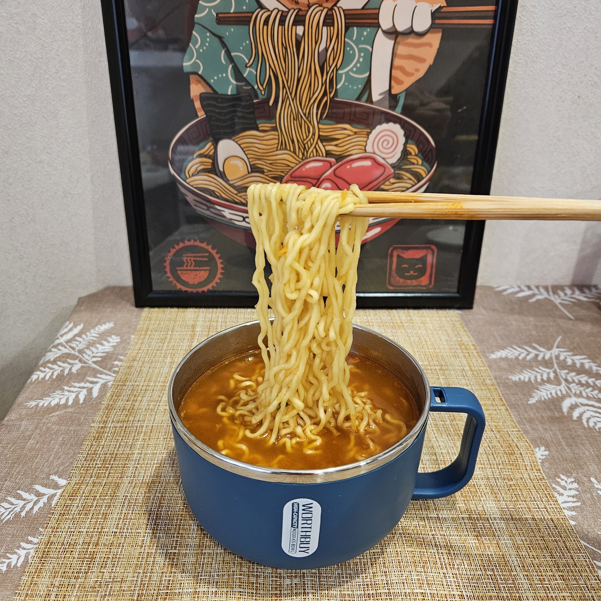 Готовим лапшу путём отваривания в 550 мл. воды в течение 4 минут, туда же сразу высыпаю приправу. По старой привычке во время варки периодически извлекаю лапшу из бульона, чтобы она насытилась кислородом. Не знаю, насколько то помогает, но, прочитав много лет назад это на упаковке Чан рамена до сих пор так делаю. После этих нехитрых манипуляций получаем весьма приличную порцию лапши в бульоне.