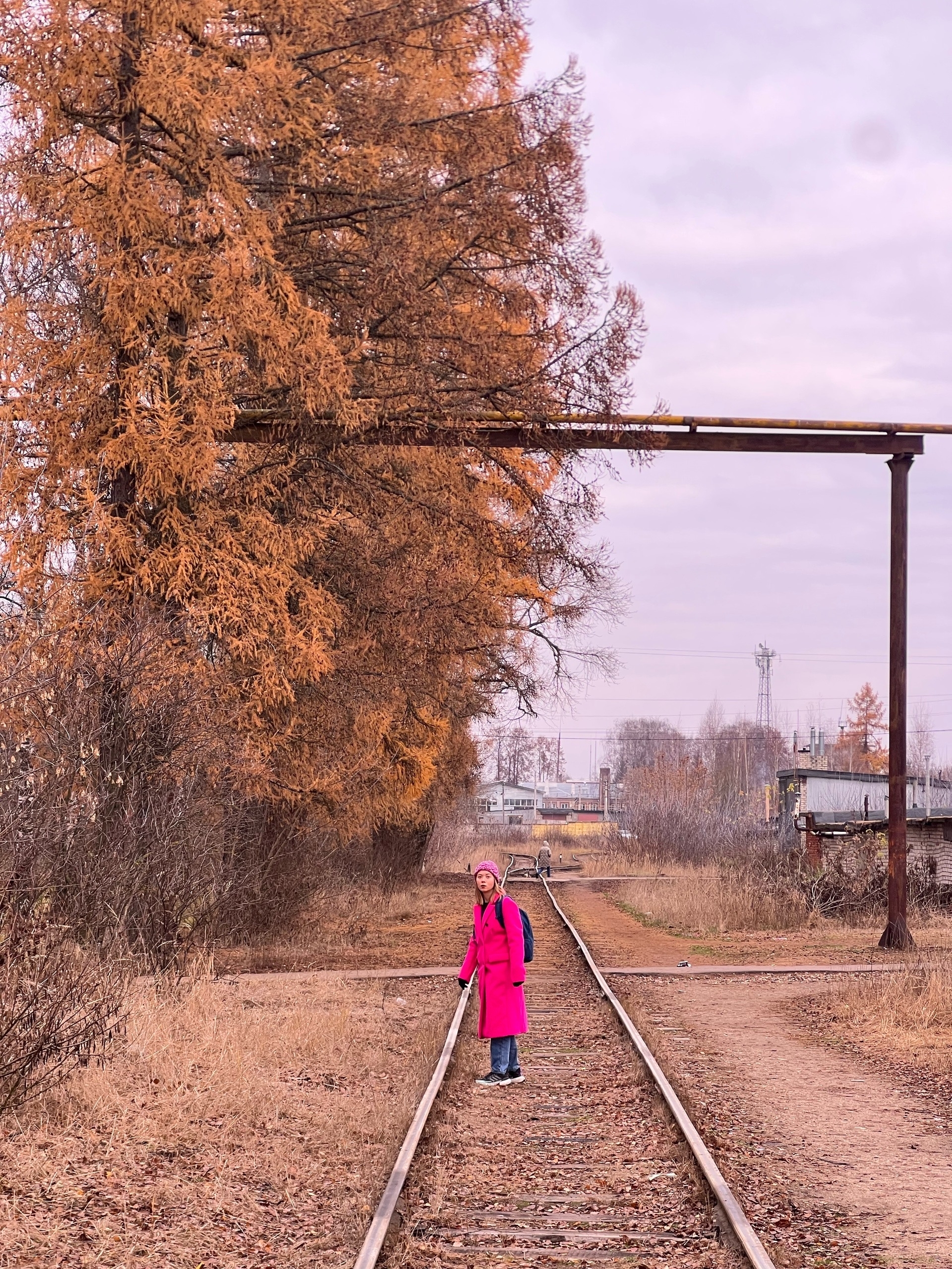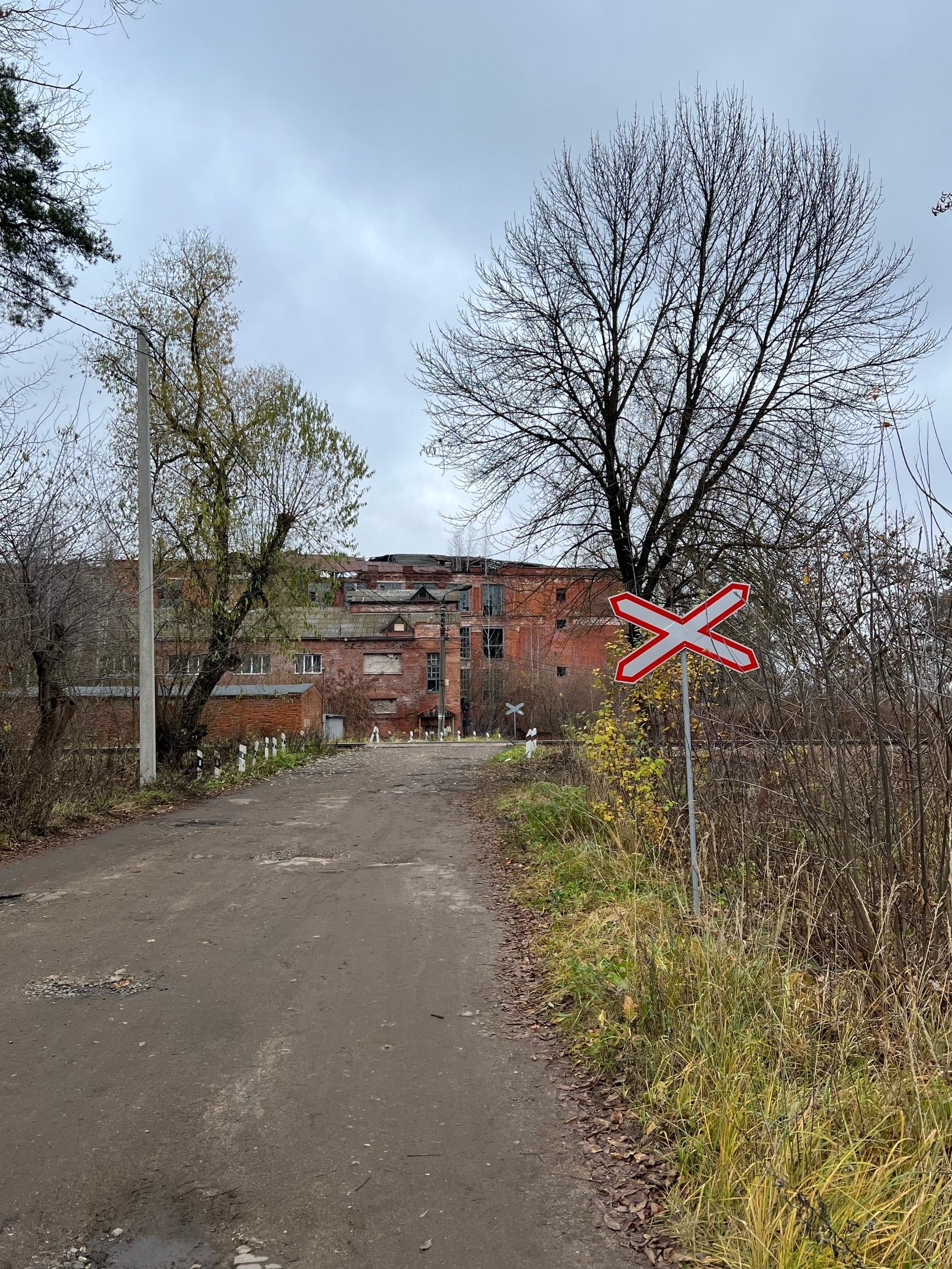 На следующее утро повел Таню к усадьбе другим маршрутом, заодно поглядев на элемент палеоландшафта – заброшенную ж/д ветку. По сути, сейчас дорога упирается в охраняемую стоянку, и все. Для меня подобные объекты представляются крайне любопытными – ведь зачастую они ведут (вели) на какое-то производство, или стратегически важный объект (опять же, военная часть или крупный склад, нефтебаза). Но здесь уже не было ничего, а судя по деревьям, которые вымахали до 10 метров в высоту, поезда по этому участку не ходили уже много-много лет.