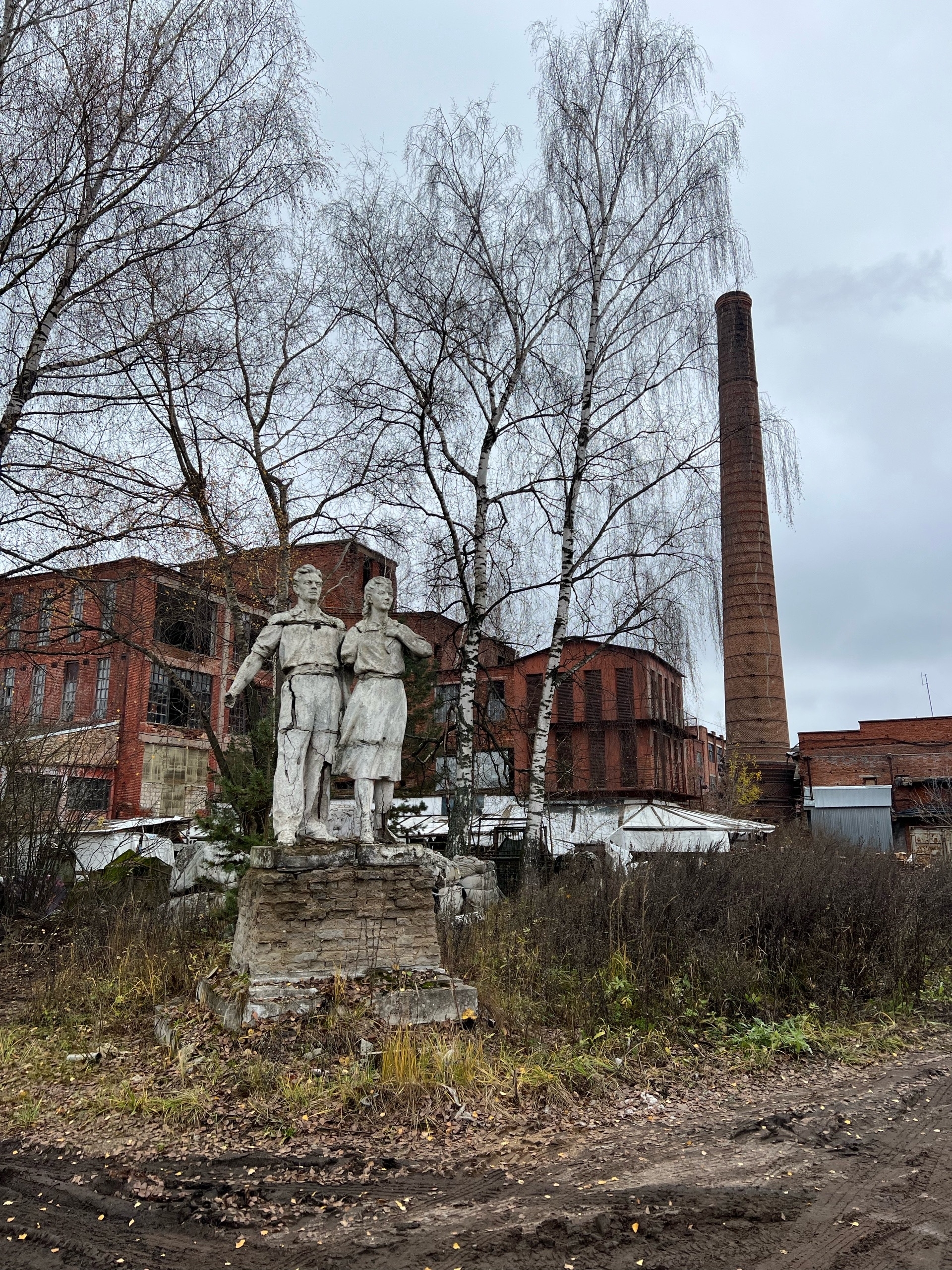 В районе проходной ткацкой фабрики еще разбросаны несколько скульптур, которые сложно увязать в единый сюжет. Ленин, какие-то девочки, слон, Айболит, конек-горбунок. На территории завода стоит мужчина с женщиной, видимо, символ работников предприятия, но их даже на карте не отмечено. В общем, атмосфера «Сталкера» - с учетом погоды за окном.