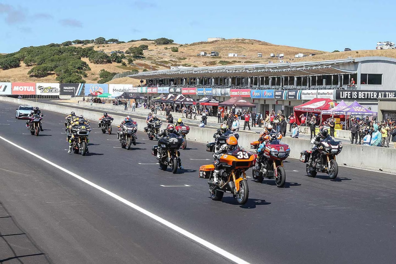 Компания MotoAmerica с 15го года "поднимает" гонки в северной Америке. У них есть ряд соревнований классического толка, но не только. В 2020м году они впервые представили King of the Baggers. Идея довольно простая — взять серийный бэггер, немного его доработать, и проехать восемь кругов по трассе. Мероприятие скорее развлекательное, чем серьезное спортивное, вот только команды-участники так не посчитали. Если посмотреть на байки поближе, видны изменённые вилки и передние тормоза, облегчена конструкция кофров (кажется что вовсе до муляжей) а батвинг так и вовсе в стиле NASCAR - с нарисованной фарой. И они гоняются! В качестве кусочка видео с гонки - удачный сейф одного из гонщиков: