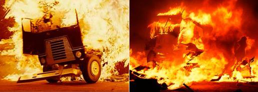 А вот Терминатор вылезает из горящего грузовика. Крыша на месте!