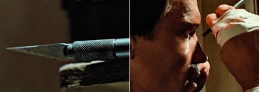 Терминатор собирается вырезать себе поврежденное в аварии глазное яблоко, для чего берет скальпель с острым лезвием, хорошо видным на крупном плане.