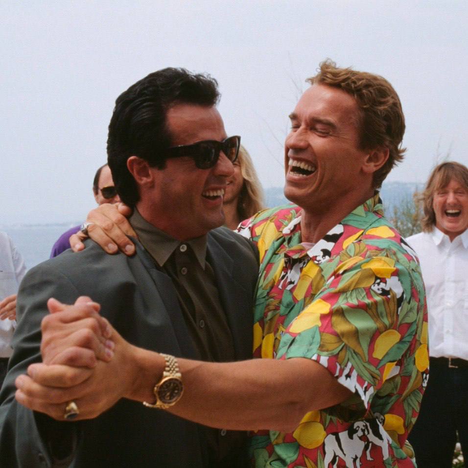 1) Сильвестр Сталлоне и Арнольд Шварценеггер танцуют на 43-м Каннском кинофестивале в 1990 году. Фильмов с их участием представлено не было, но активно конкурирующие в то время голливудские звёзды не могли не поторговать лицом себя на престижном мероприятии, к тому же активно распространяемые слухи о возможном совместном проекте героев боевиков, знатно подогревало интерес публики к их персонам.