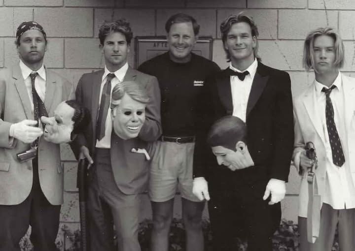5) Групповое закулисное фото "плохишей" во главе с Патриком Суэйзи со съёмок культового боевика "На гребне волны" (1991). В фильме героя Суэйзи зовут Бодхи, что является сокращением имени Бодхисатва. Бодхисатвой, согласно буддийской мифологии, называется тот, кто стремится к духовному просветлению.