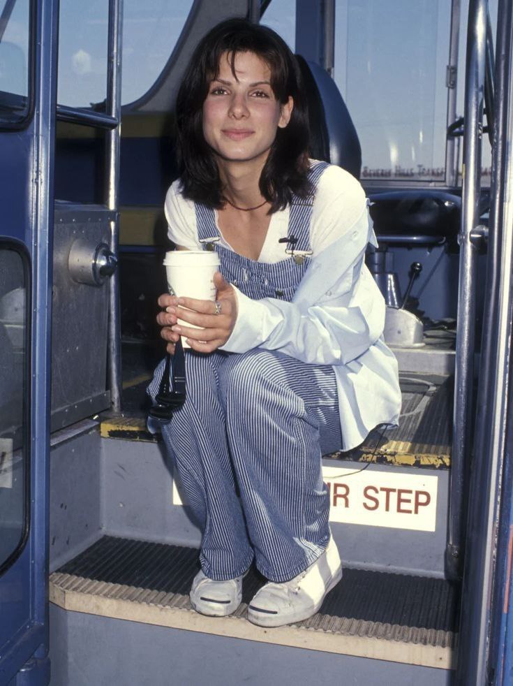 2) Сандра Буллок на закулисном фото со съёмок фильма "Скорость" (1994). В списке Американского киноинститута "100 самых захватывающих фильмов" картина заняла 99-е место. Буллок ради фильма ходила на курсы по вождению автобуса. В итоге актриса с первой попытки сдала экзамен и получила соответствующие водительские права.