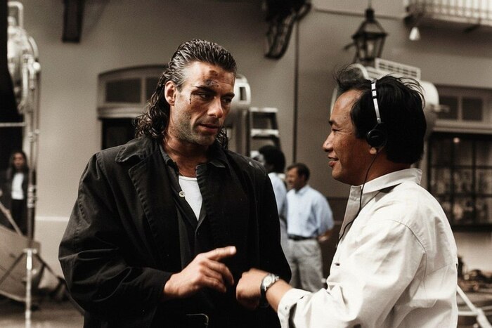 4) Жан-Клод Ван Дамм и Джон Ву на закулисном фото со съёмок культового боевика "Трудная мишень" (1993). Гонконгский маэстро экшен-жанра при производстве своего голливудского дебюта был очень неприятно удивлён местными "правилами игры" и властью продюсеров и "главной звезды" картины, которые повсеместно вмешивались в процесс со своими советами. По требованию Ван Дамма, например, как минимум одна камера должна была снимать только его мускулы. По словам постановщика, отснятую на неё плёнку в итоге не использовали, но такая камера действительно была.