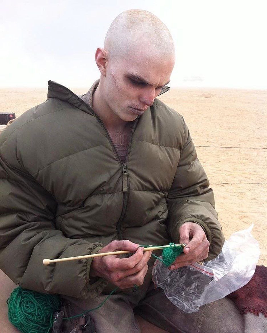 3) Николас Холт постигает премудрости вязания в перерывах между съёмками ленты "Безумный Макс: Дорога ярости" (2015). В одном из интервью актёр рассказал, что научился орудовать спицами так ловко, что даже начал вязать вещи для съемочной группы, по мелочи (шапки, шарфы) но однажды "заказов" стало так много, что в один выходной ему пришлось сидеть в своем гостиничном номере и вязать, чтобы успеть в срок, после чего пыл пришлось умерить.