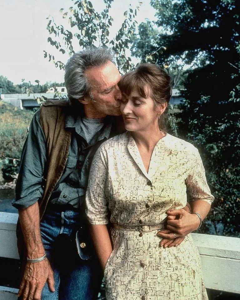 4) Клинт Иствуд и Мерил Стрип милуются для промо-фото к премьере фильма "Мосты округа Мэдисон" (1995). Мэрил Стрип пришлось набрать вес для роли, чтобы выглядеть на экране обычной американской домохозяйкой средних лет.