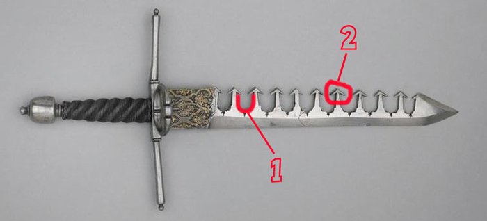 Дентайр от всех прочих кинжалов отличается тем, что им можно не только парировать клинок, но и "случайно" поймать его, в выемки (1), при некотором везении.