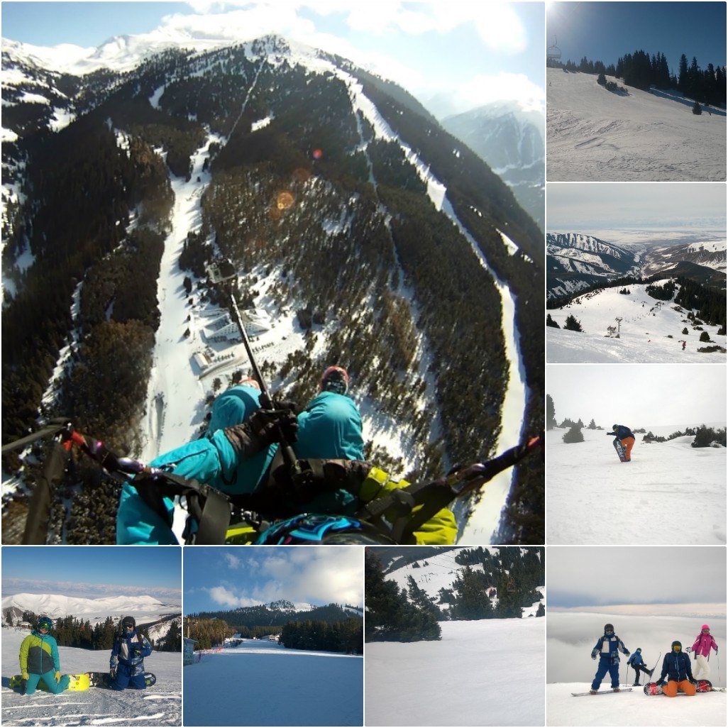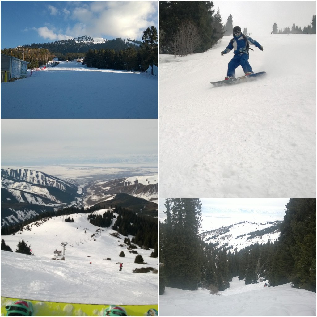 Теперь не много о самих трассах и нашем катании. Со снегом нам конечно не очень повезло, но всё же его было достаточно. В лесу так вообще не плохо… При желании по пояс можно было провалиться… И любители попадать под елки, это делали… С Панорамы (3040) открывается чудесный вид на пики Пржевальского (4273), Джигит (5170), Каракол (5216), озеро Иссык – Куль. Погода была чудесная. Нам повезло, мы застали и снежок, и солнышко, и «молоко», и катались выше облаков… Большинство катающихся в Караколе это лыжники (есть своя лыжная школа). Сноубордистов мало и чаще это туристы. Сами трассы разнообразны. С одной можно проехать к другой, можно уехать в лес и выкатить обратно на трассу. Большая часть трасс широкие. Но можно найти узкие места с большим уклоном. Есть места с большим количеством бугров. Под подъёмниками тоже раскатано. Но, хочу заметить…нигде не видела такого большого количества падающих лыж и лыжных палок с подъёмников… так что надо быть внимательными катаясь там. В лесу достаточно часто растущие деревья и много кустов. Катаясь по лесу, внимательно изучите карту (её можно бесплатно взять в кассе, при покупке ski pass), так как если вы попадёте в кулуар, то выкатить получится, скорее всего, уже ниже базы или на дорогу. Ну или разувшись преодолевать достаточно не приятный затяжной подъём. Хотя с другой стороны, бесплатно сходите в Ski тур ;))) С преодолением вершины метров в 60, проваливаясь по пояс в снег… Так что каждый может выбрать, то что ему по душе)). У самой базы «Каракол» находится учебная трасса, с минимальным уклоном. Очень удобная для обучения детей. С 3х местным кресельным подъёмником.
