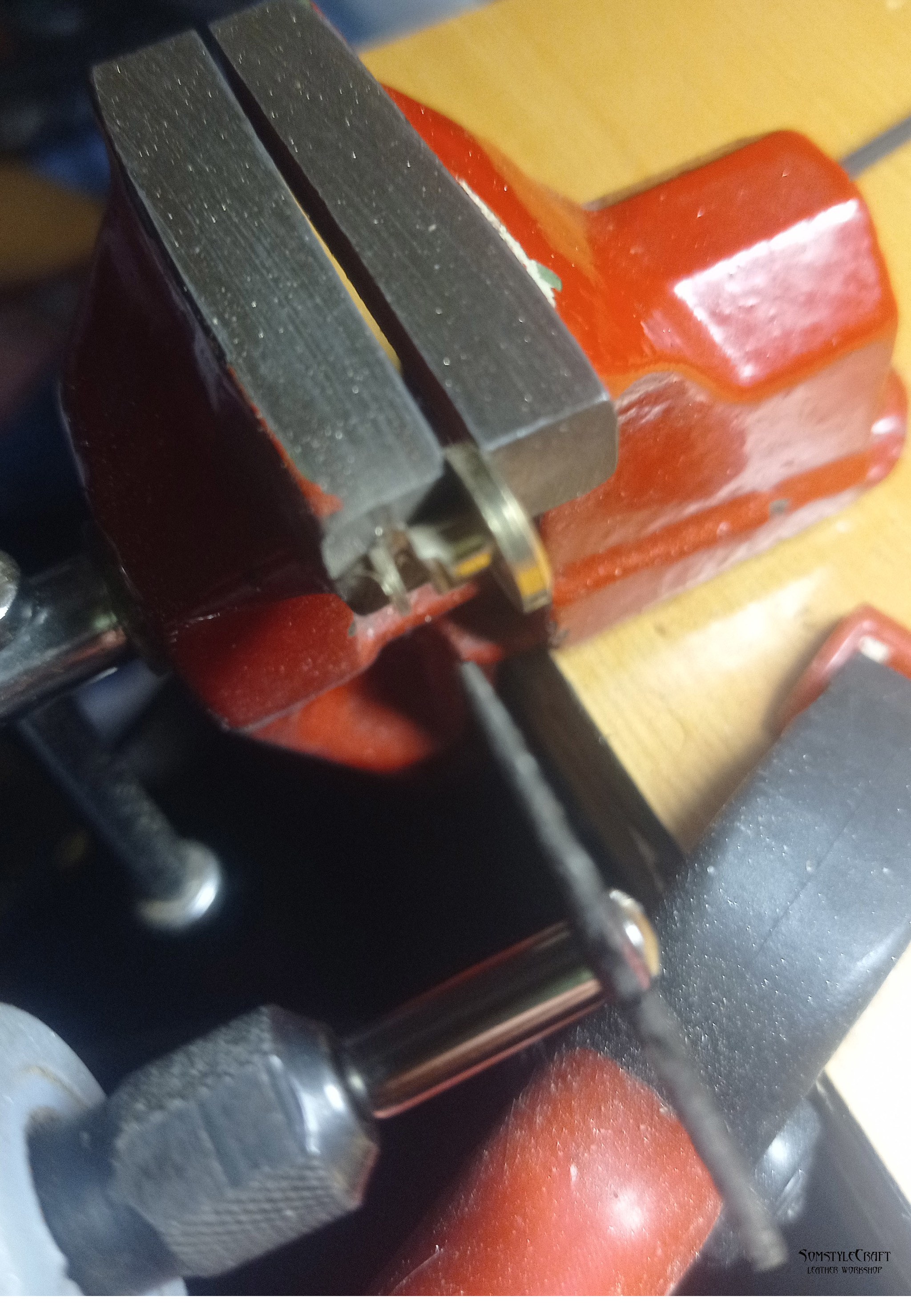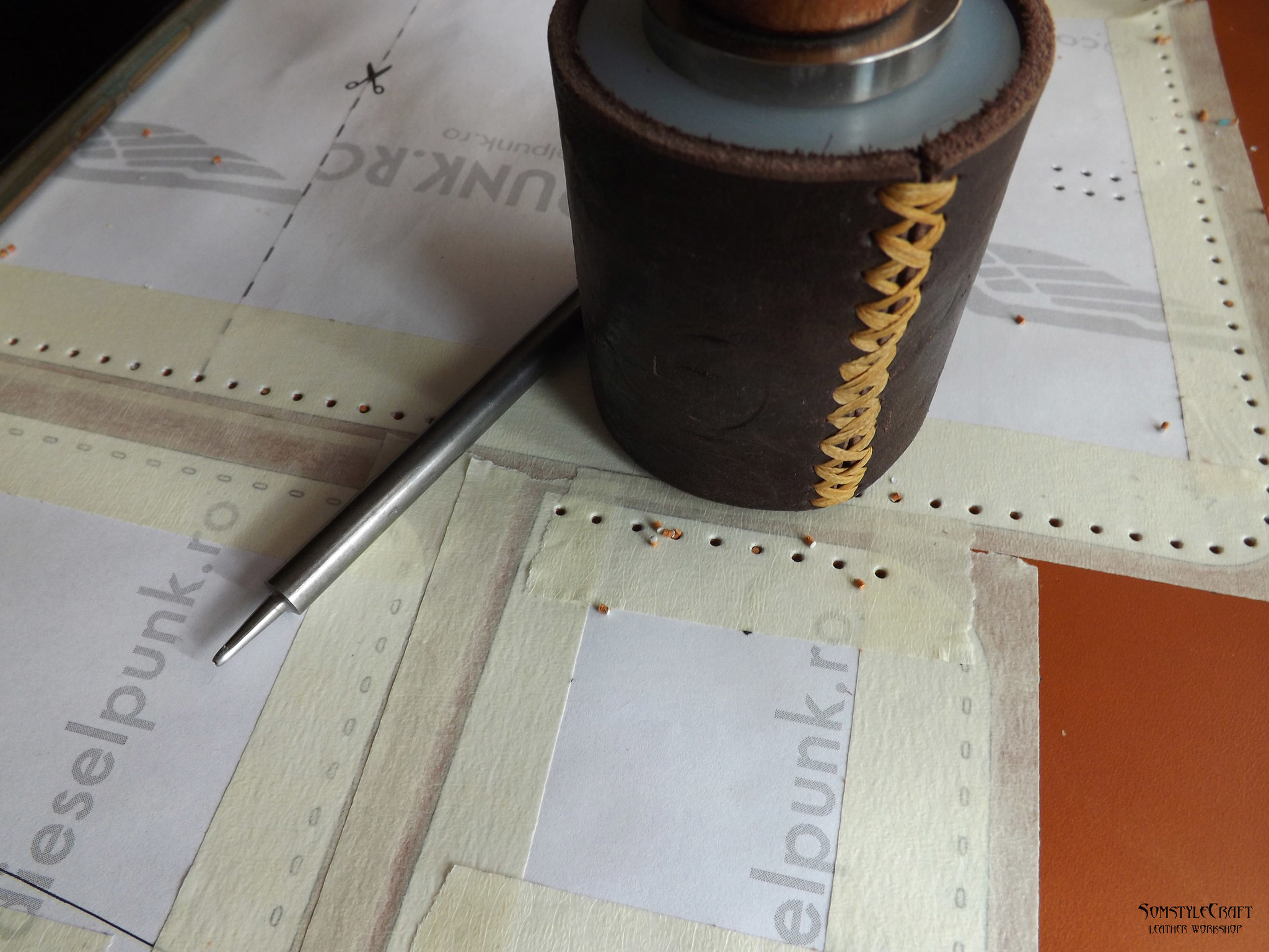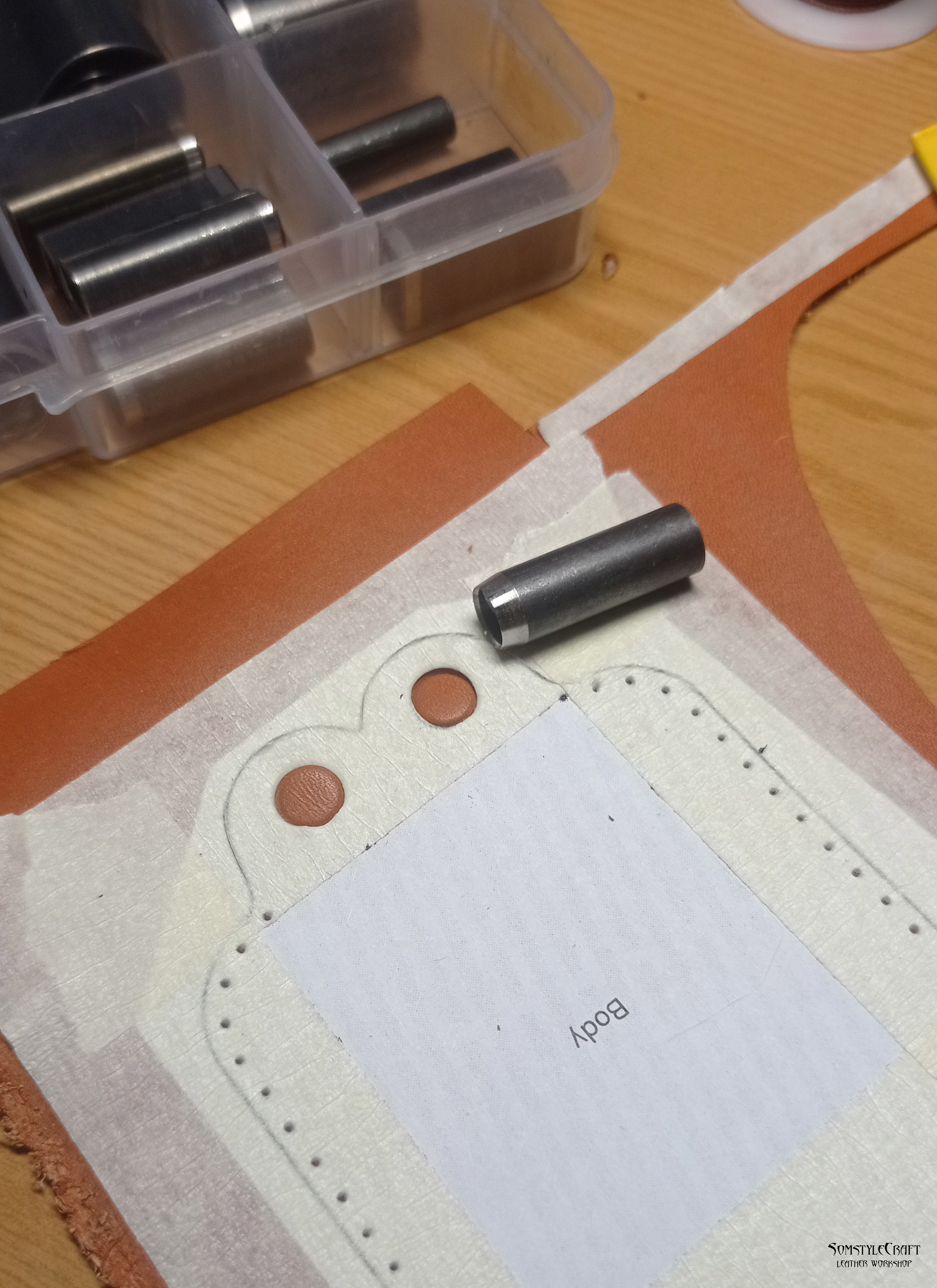Выкройка распечатана и наклеена с помощью малярного скотча на кожу. Пробойник на фото, также молоток (Китай, обтянут чепраком 4 мм).
