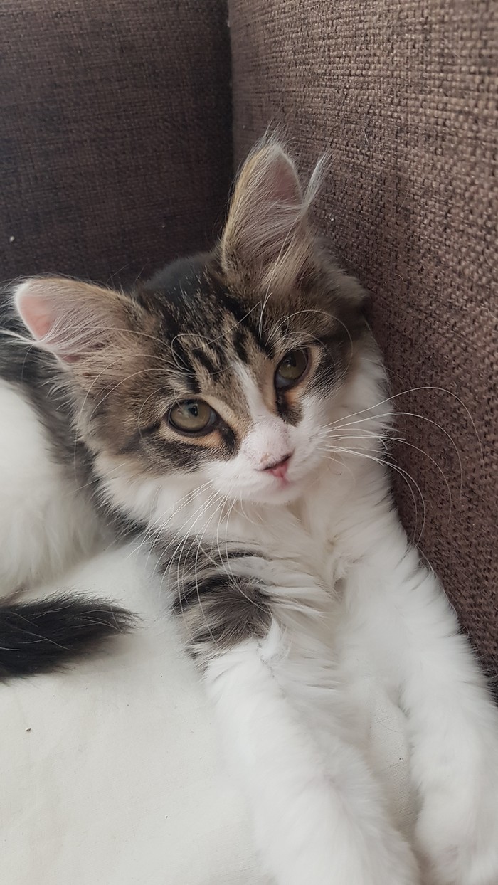 Взяли в ноябре месячную девочку, подросла. Сейчас 3 месяца. Порода хайленд-страйт, т.е. длинношерстная шотландская прямоухая. На 4 фото мама, потом папа черный. Очень ручная девочка. Просится на руки, лапками мнет, тарахтит :)