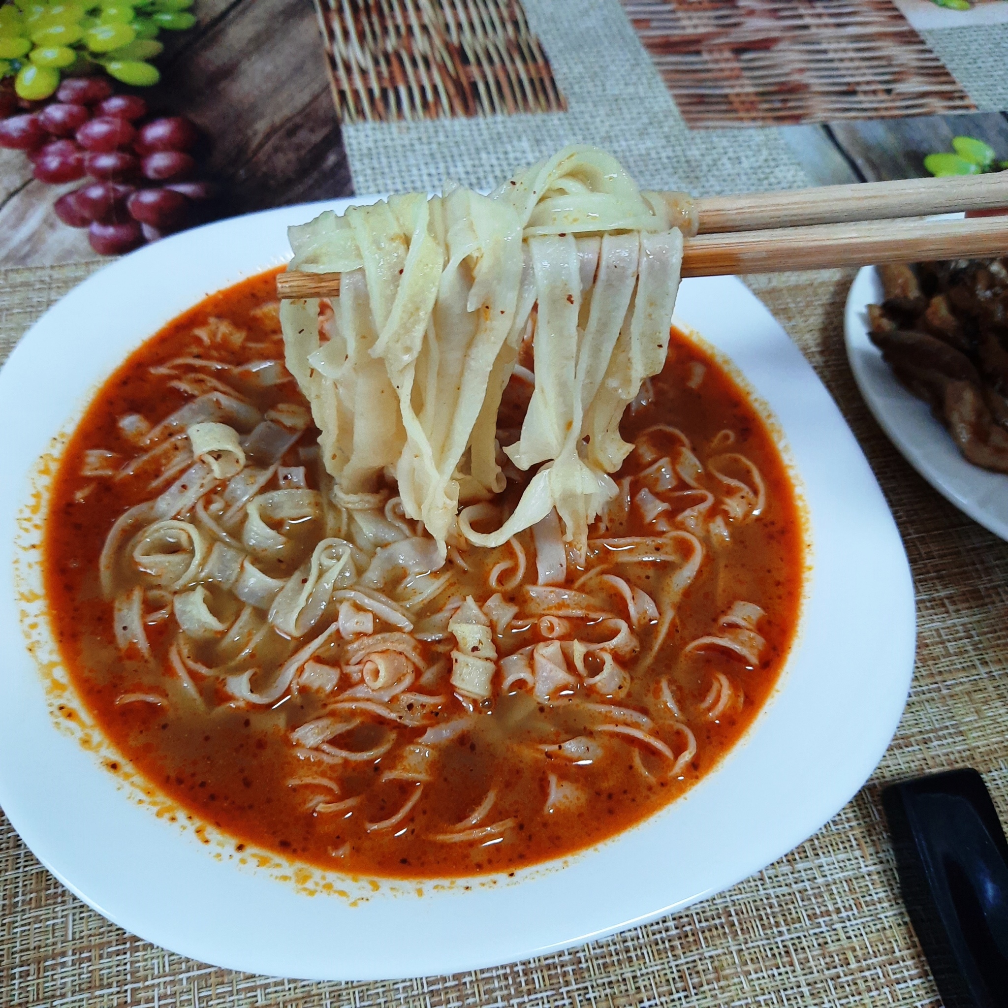 Приступаем к долгожданной дегустации. Начинаю как обычно с бульона. Бульон очень даже хорош! Насыщенный, не острый (в пределах одного красного дошика), пряный и жирный. Среди всей лапши с данным вкусом, которые я пробовал, этот бульон показался мне самым вкусным. Часто бывает, что в бульоне преобладает один какой-то вкус. Чаще всего это кислота, а остальные теряются. Здесь же просто идеальное сочетание соленого, пряного, острого и кислого. За бульон 100% зачет! Лапша. Ох, лапша-лапша, до чего ж ты хороша! Лапша просто великолепна! За счет своей широкой формы она очень похожа на домашнюю лапшу. За 6 минут она не размокла, но впитала в себя ароматы бульона. У лапши шикарная текстура. Она плотная и упругая, ее требуется хорошенько пожевать. Могу сказать, что это самая вкусная лапша из тех, что я пробовал за последнее время. Также хочу отметить большой размер порции.