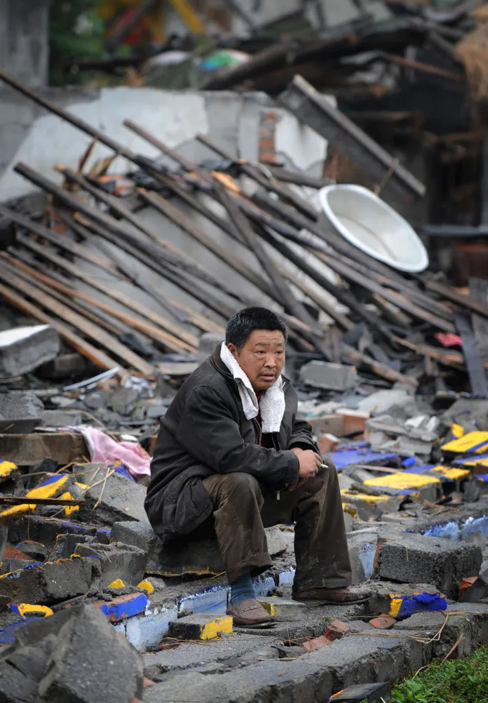 Китайский фермер сидит на развалинах своего дома через день после землетрясения магнитудой 7,8 балла в провинции Сычуань в 2008 году. (Марк Ралстон/AFP via Getty Images)