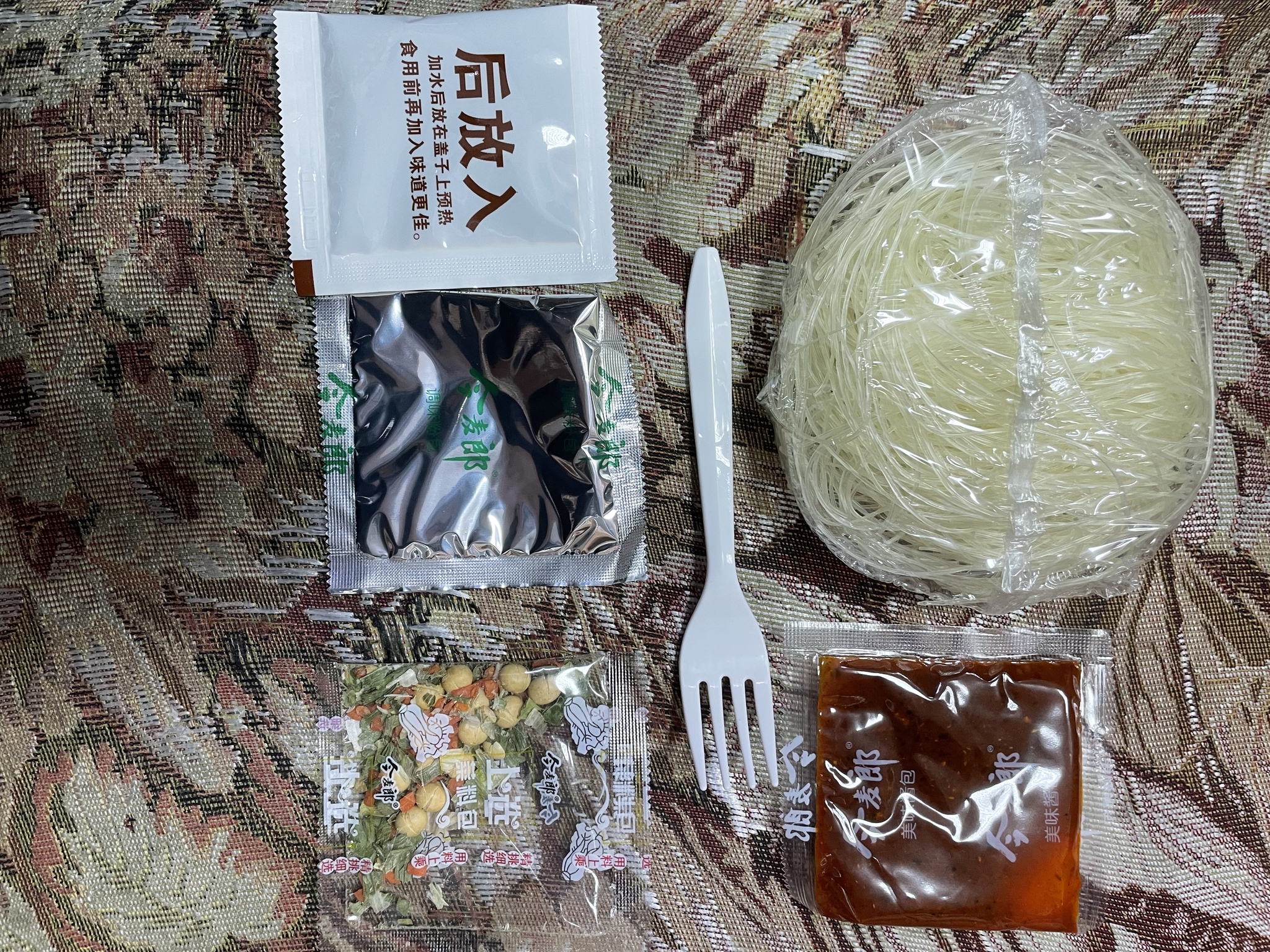 В упаковке вы найдете все необходимые ингредиенты: соевый соус, специи, кисло-сладкий соус, вилку для удобства, сушеные овощи и, конечно, фунчозу
