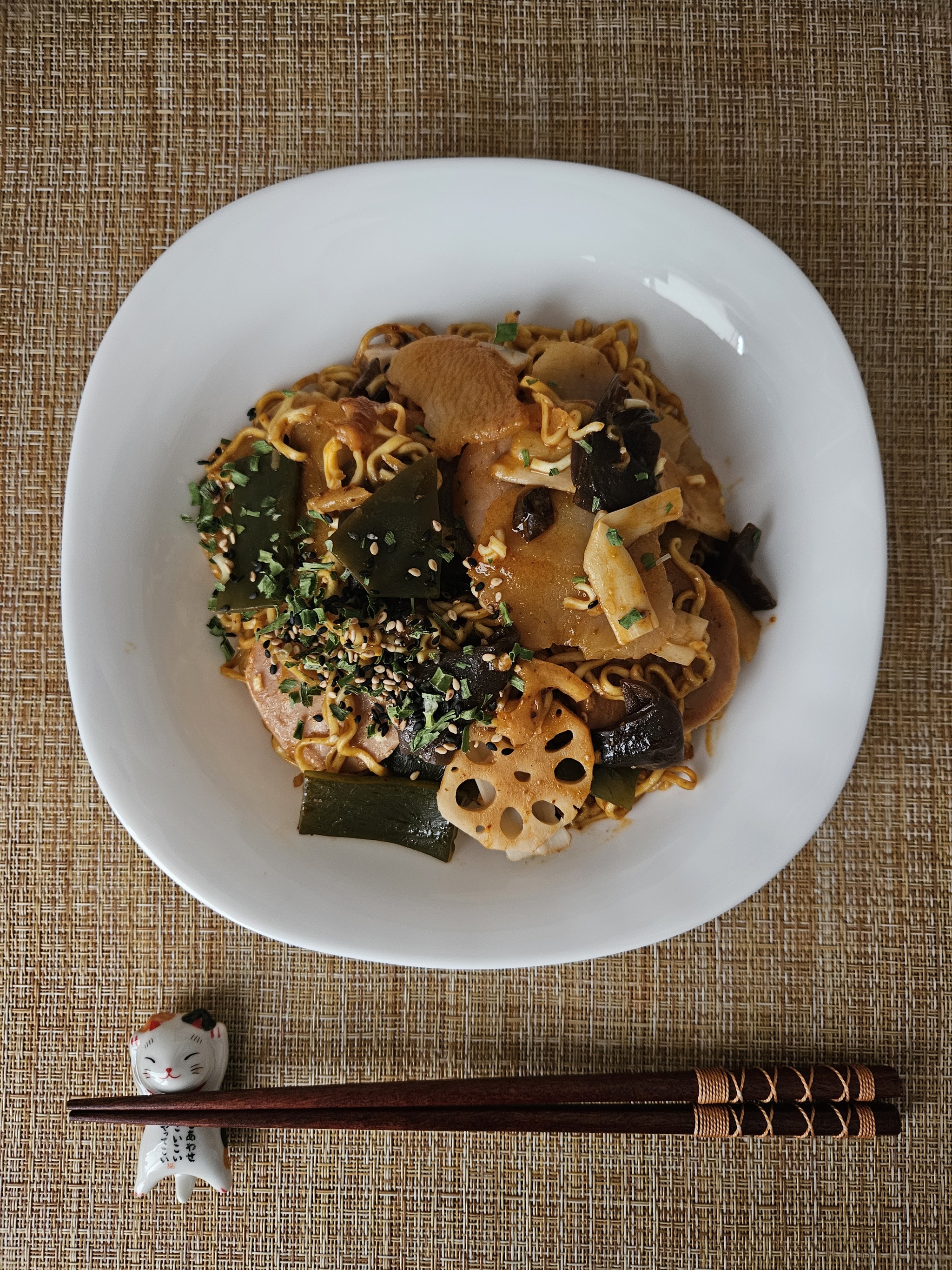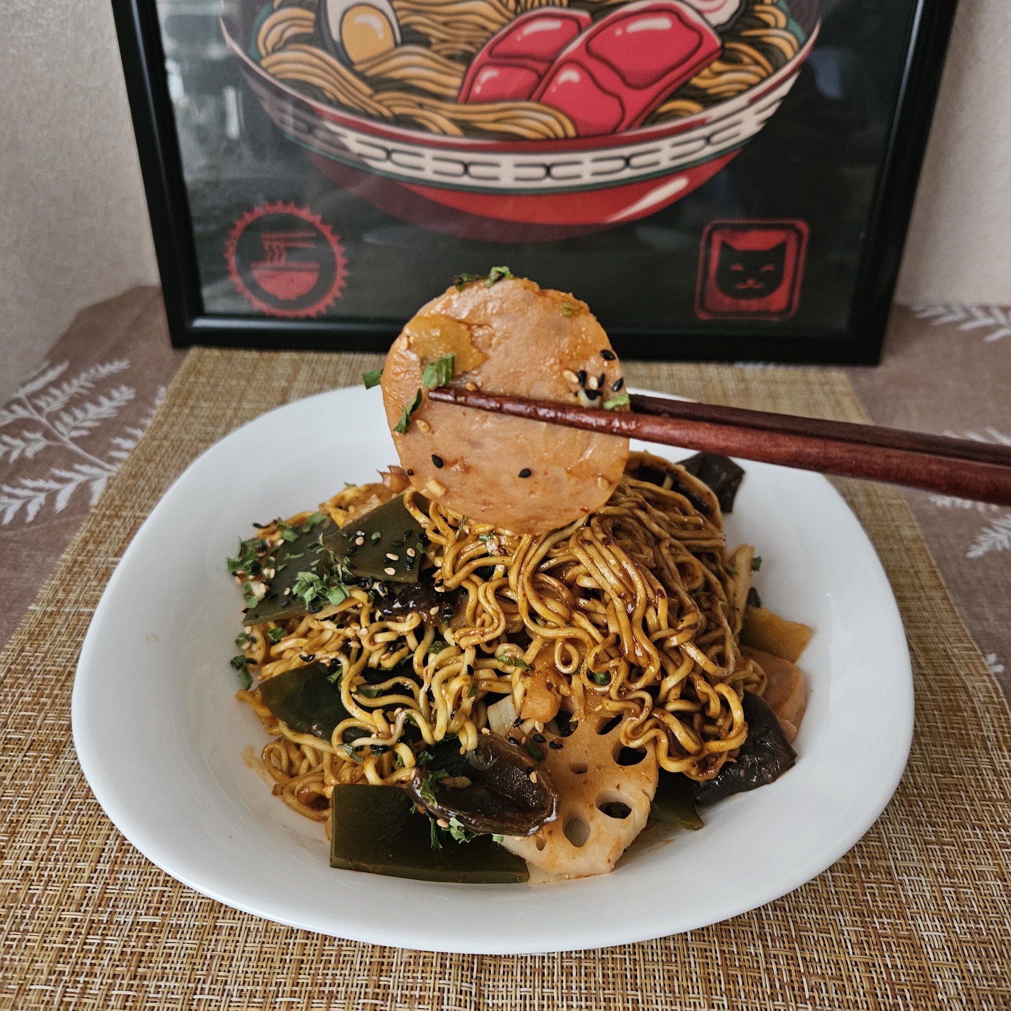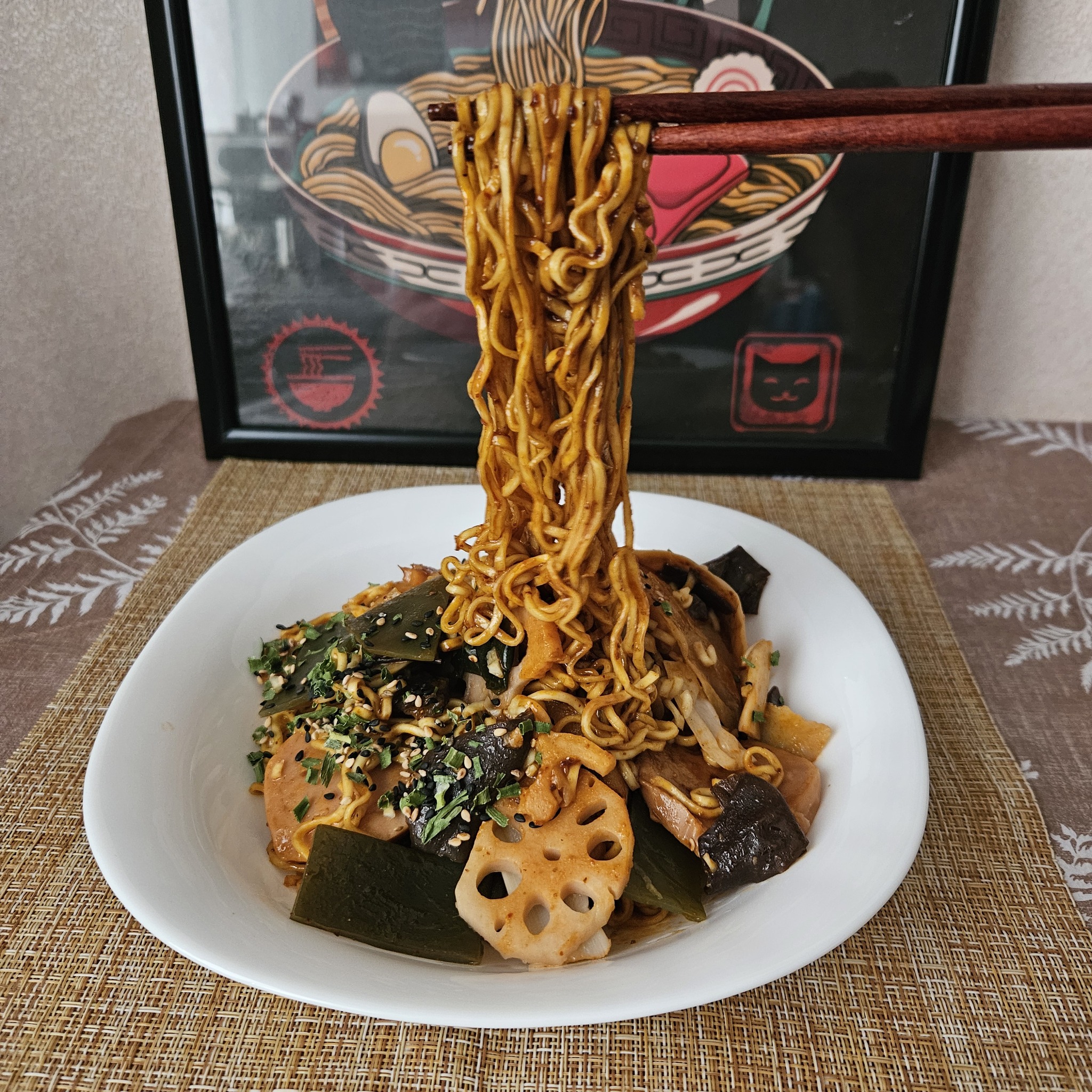 Лапша шикарная! Несмотря на свою тонкость она не размякла, осталась вполне плотненькой. А кунжутный соус покрыл её приятной вязкостью. Во вкусе преобладают китайские пряности, чувствуется зира, значительная сладость. Остроты, в привычном её понимании, тут нет. Зато чувствуется сычуаньский перец, который ощущается несколько по другому. В целом пряность на высоком уровне, но очень вкусно! Ну и пробежимся по остальным ингредиентам. Овощи очень неплохи. Картошка, на удивление, не хрустит, как обычно. Капуста и грибы вкусны. Корень лотоса (не самый мой любимый компонент) как раз хрустящий. Ну есть, да и ладно. Но не было бы его, не расстроился бы.