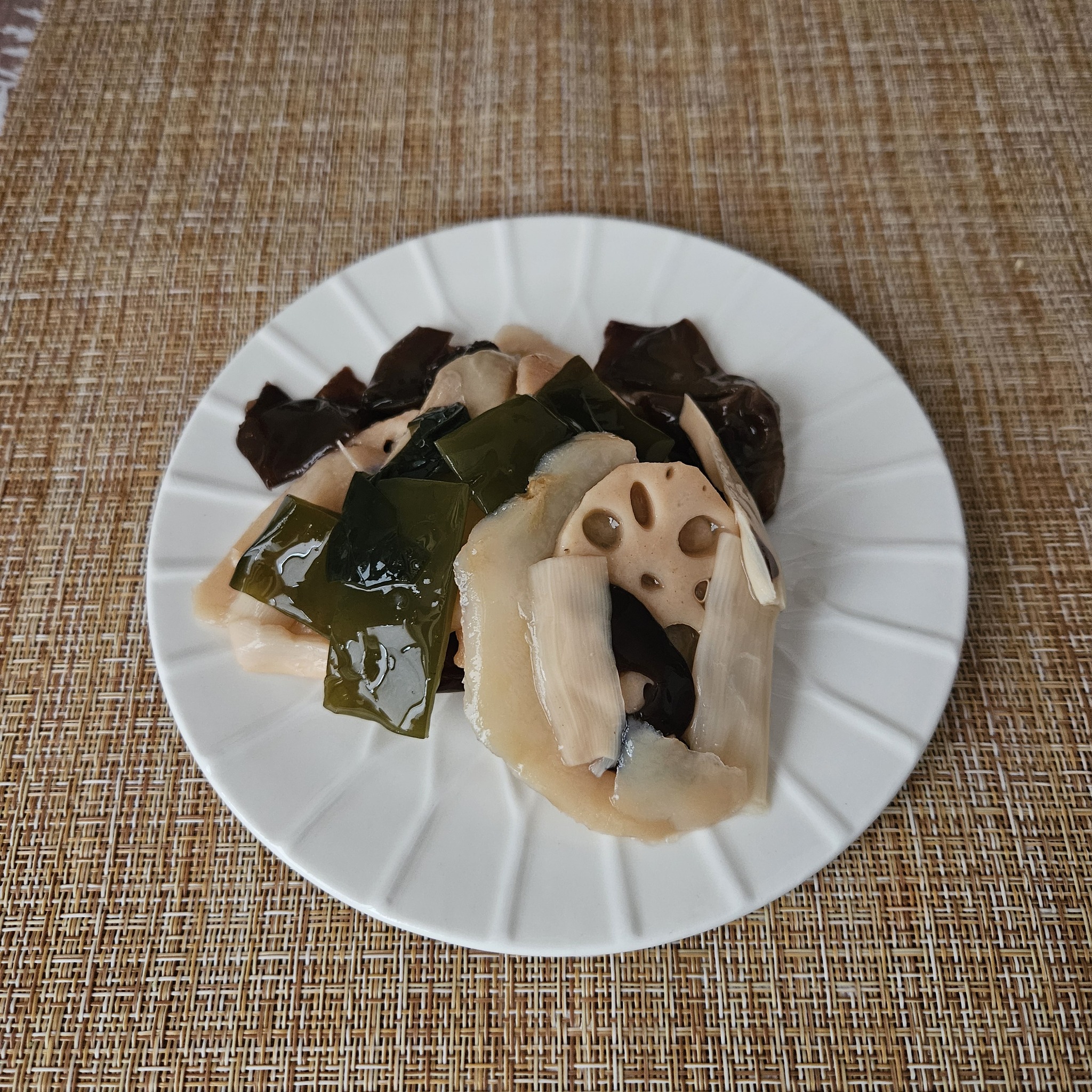 В самом большом пакете маринованные овощи. Тут всё по стандарту. Морская капуста, грибы, картофель, корень лотоса и бамбук.