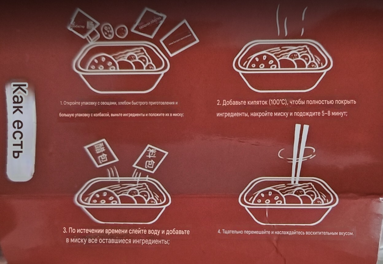 Процесс готовки описывать не буду, а прикреплю скрин с переводом с упаковки. Лишь добавлю, что я держал в кипятке 6,5 минут.