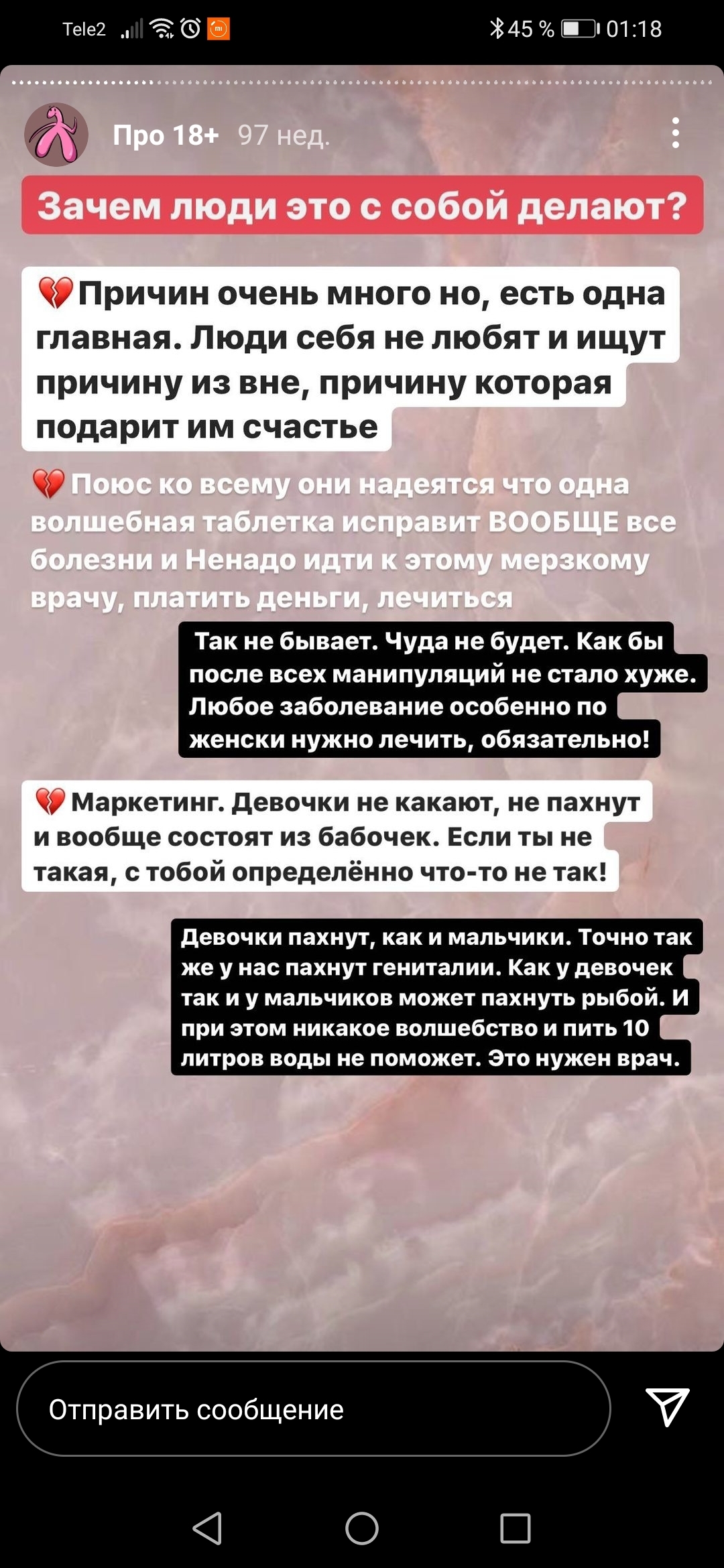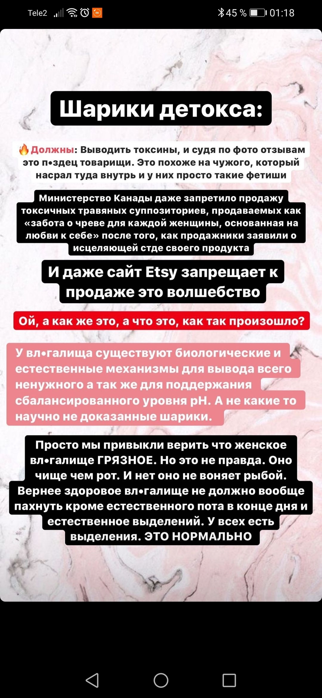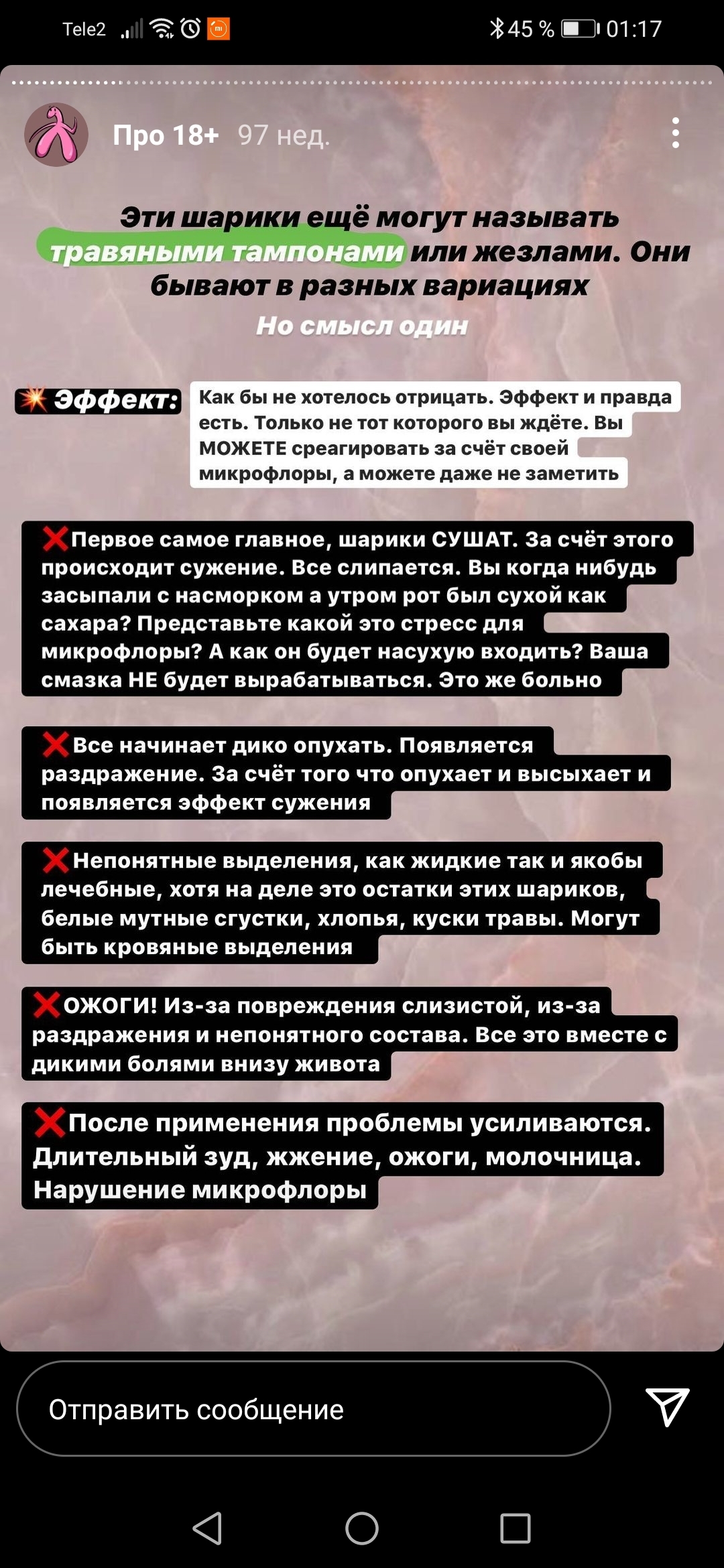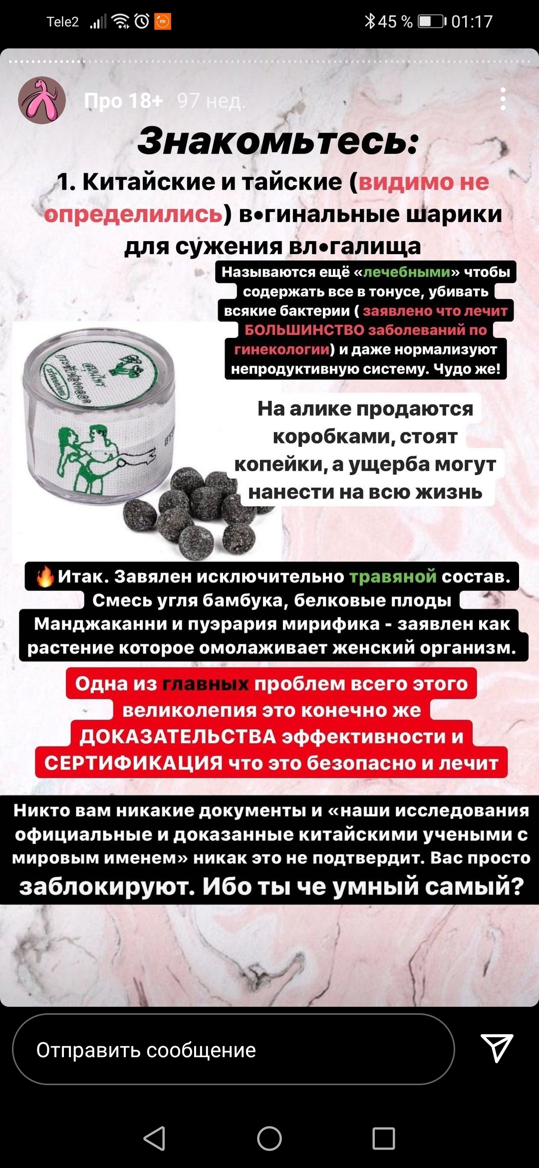 2. «Вот какая логика у женщин, которые верят: китайский тампон из травы и марли надо запихать себе в интимное место на 3(!!!!!) суток, и потом у тебя миома из матки выйдет(????)<…>