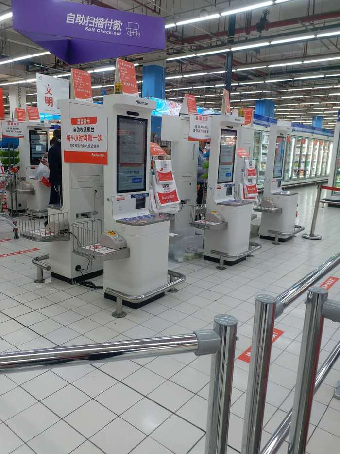 Есть обычные кассы, но туда ходят только бабули с наличкой. Я поначалу тоже была бабулей, потому что не знала как пользоваться кассами самообслуживания. Никаких ограничений по количеству покупок, хоть 2 тележки можно принести. Оплата через алипей или таобао.