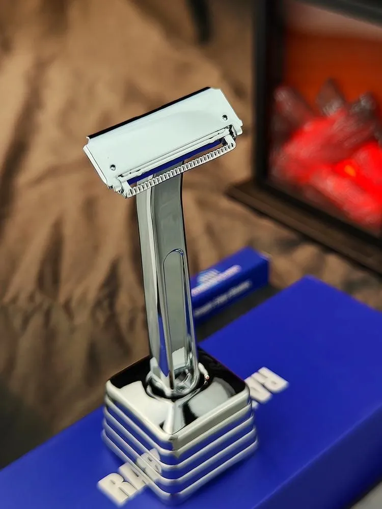 Выпускается в нескольких цветах. В комплекте идёт и подставка. На озоне заявлено что ручка из цинкового сплава, а сама голова - из нержавейки. Весь вес приходится на ручку. Бритва имеет два отсека для лезвий и во обоих отсеках агрессивность показалась идентичной. Крышка фиксируется на зажиме. Бритва считается агрессивной.