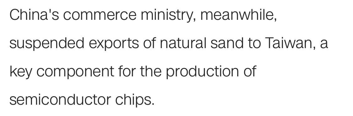 Встречаю очень много стеба и мемов по поводу китайской ответки Тайваню в следствие последних событий, а именно о запрете на экспорт природного песка. Но на самом деле не так чтоб и смешно учитывая: