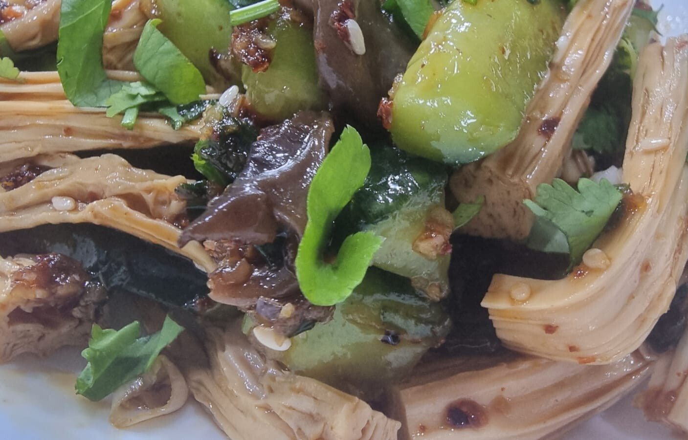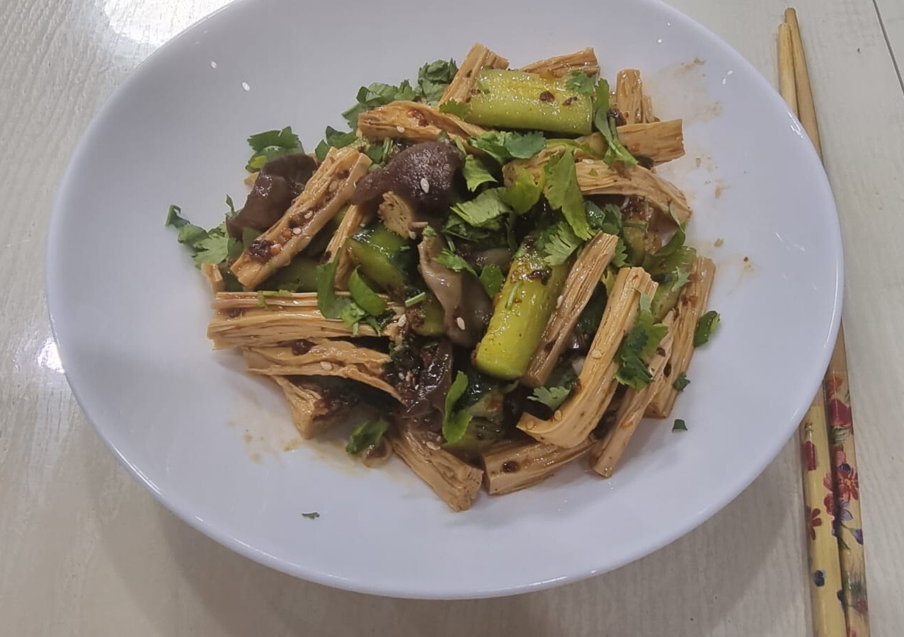 Что сказать. Это вкусно, аппетитно, свежо, ароматно, остренько. Различные текстуры, от мягких фучжо и грибов, до хрустящих свежих огурцов и жаренного арахиса.