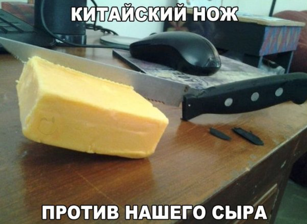 Далее человек замечает надпись "Сделано в Китае" и делает соответствующие выводы, привязывая качество товара к стране изготовления. Все это нередко сопровождается постами на разных формуах и сайтах, включая этот, с содержанием типа "Китайские бокорезы против советской проволоки" или "Китайский нож против русского масла". (баянометр ругается на это фото)