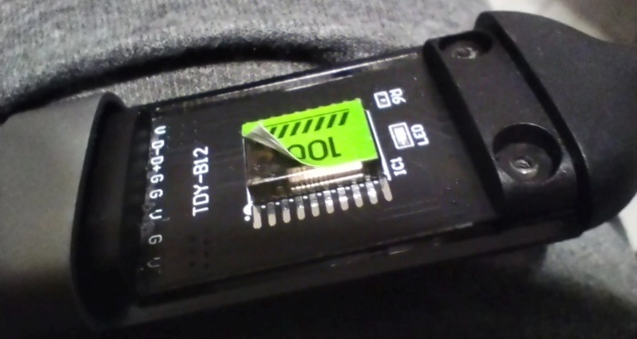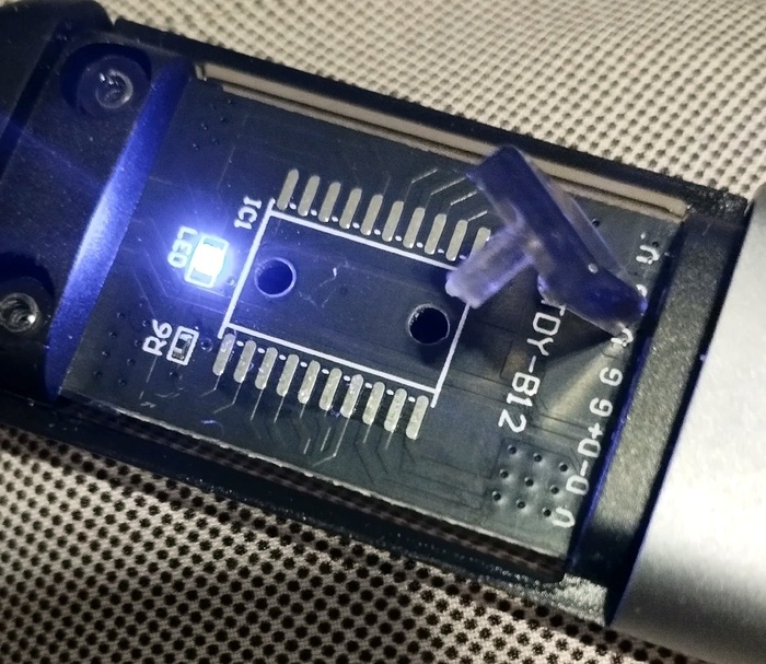 К трехголовому кабелю сделали коробочку со светодиодом и большим «чипом», заклеенным наклейкой. Под наклейкой – пластиковая заглушка. Сделано все нарочито грубо и выглядит как шутка. Однако про шутку в описании ни слова. Все серьезно.