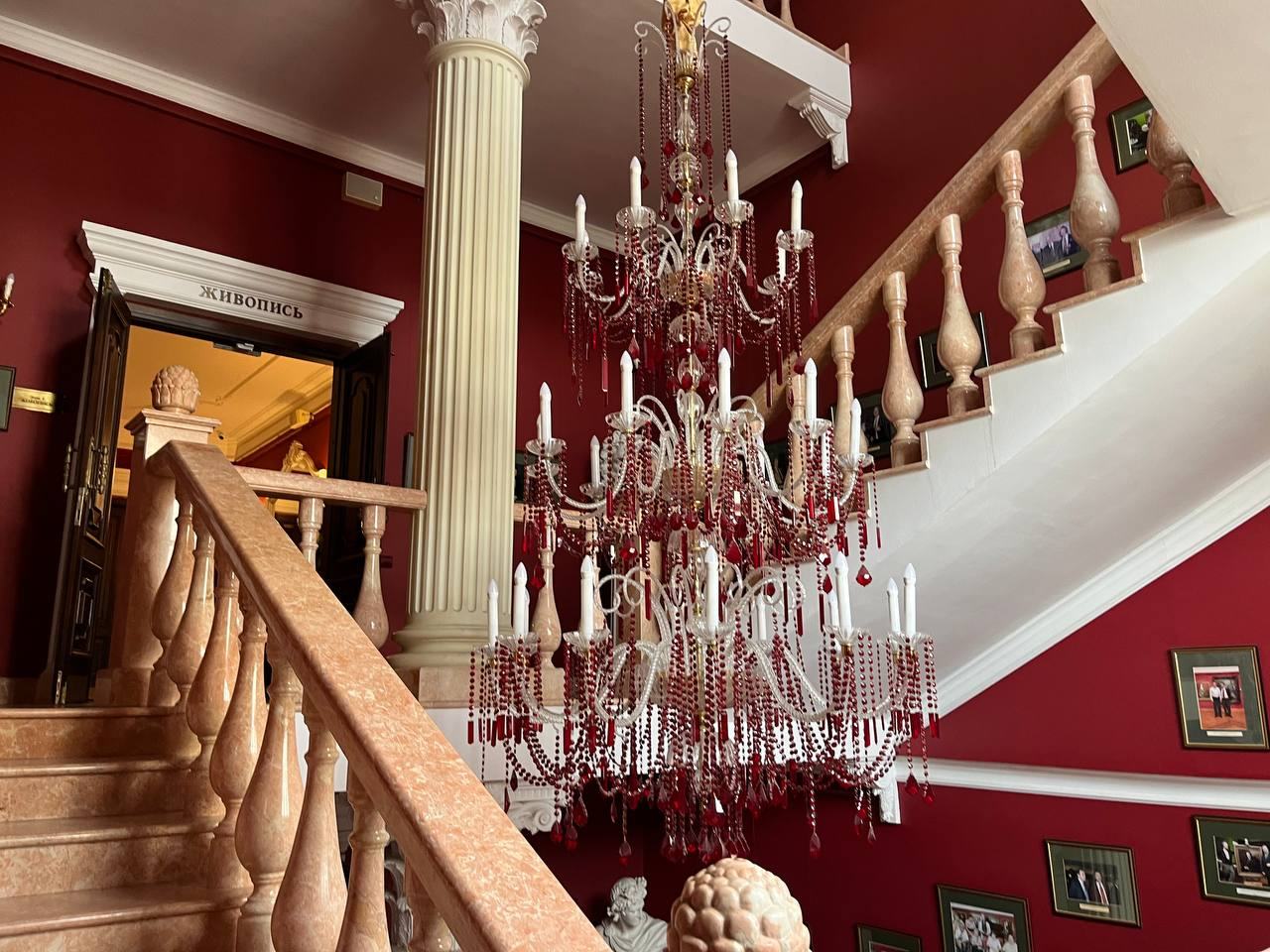 Проходим в выставочные залы по лестнице, смотря на такую парадную люстру. Всего в музее 3 этажа и во всех выставляются картины, в основном портреты, но иногда и встречаются натюрморты и пейзажи.