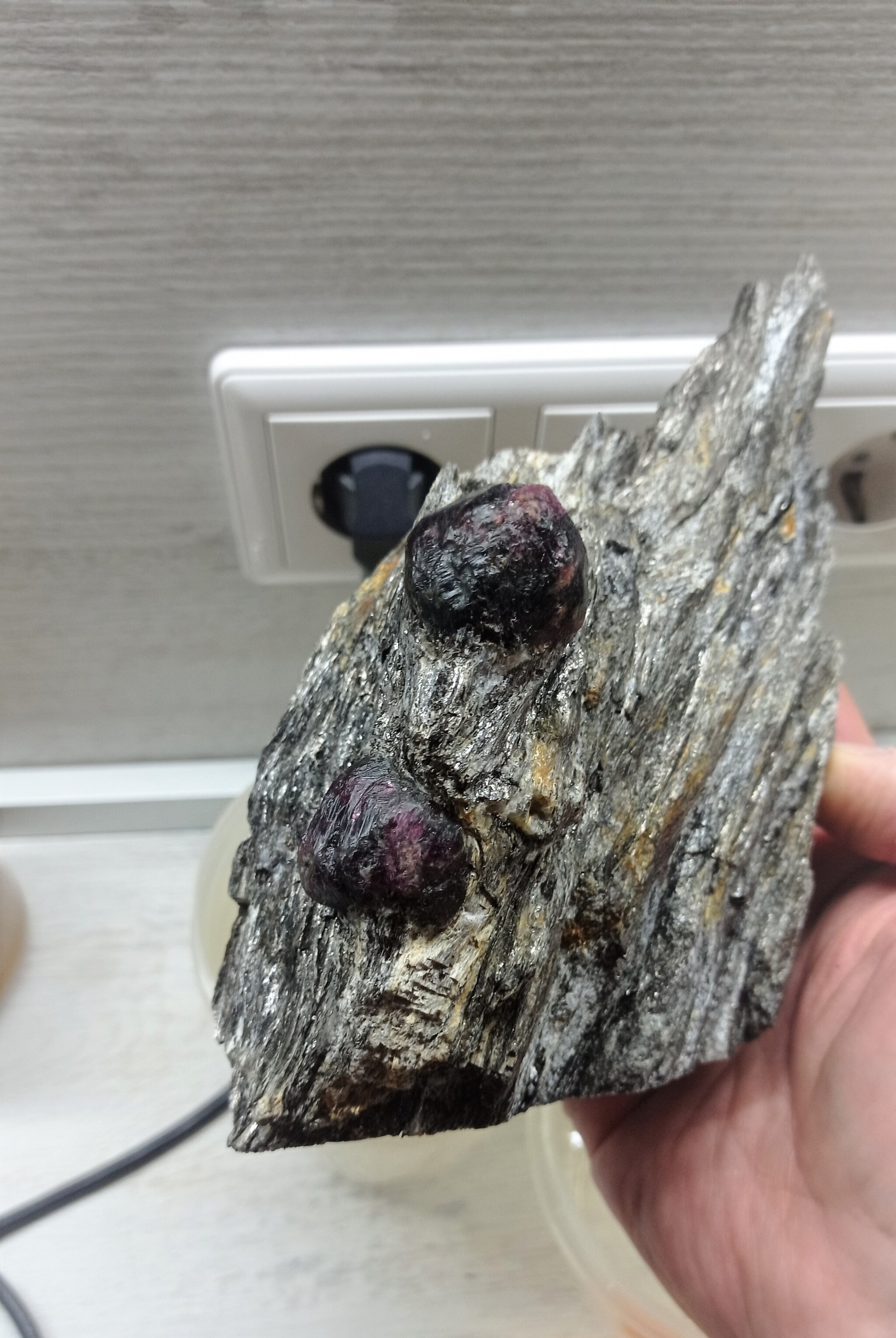 Кристаллы граната (альмандин) в слюдяном сланце. Кительское месторождение, Приладожье, Карелия.