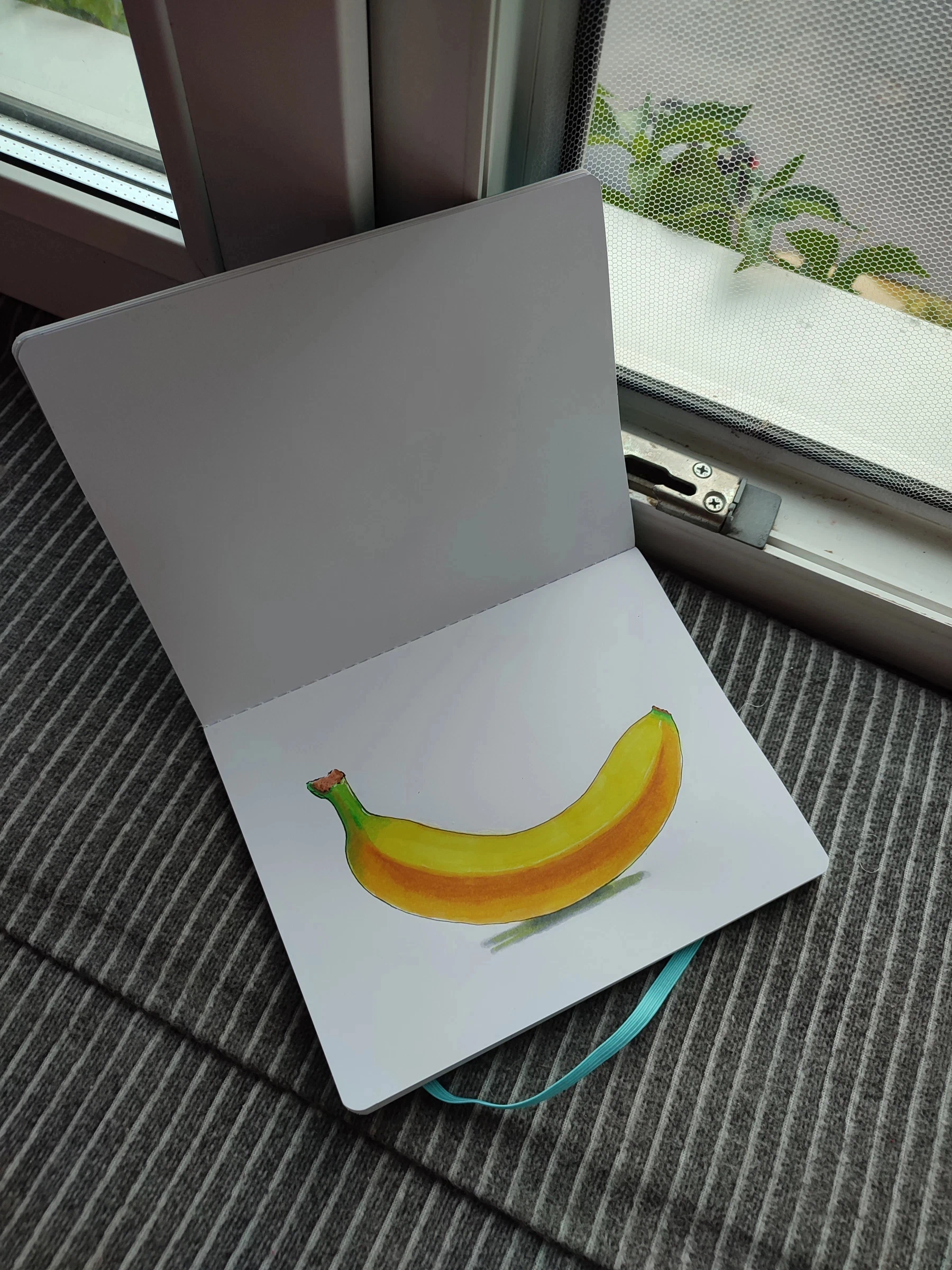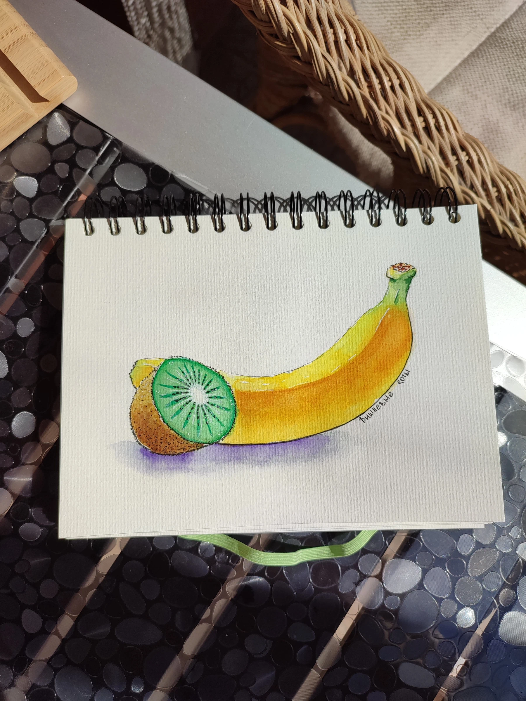 Моими пробными работами стали киви и банан по урокам от Volha School. Причем киви пришлось перерисовывать, так как первый киви вышел каким-то усталым.