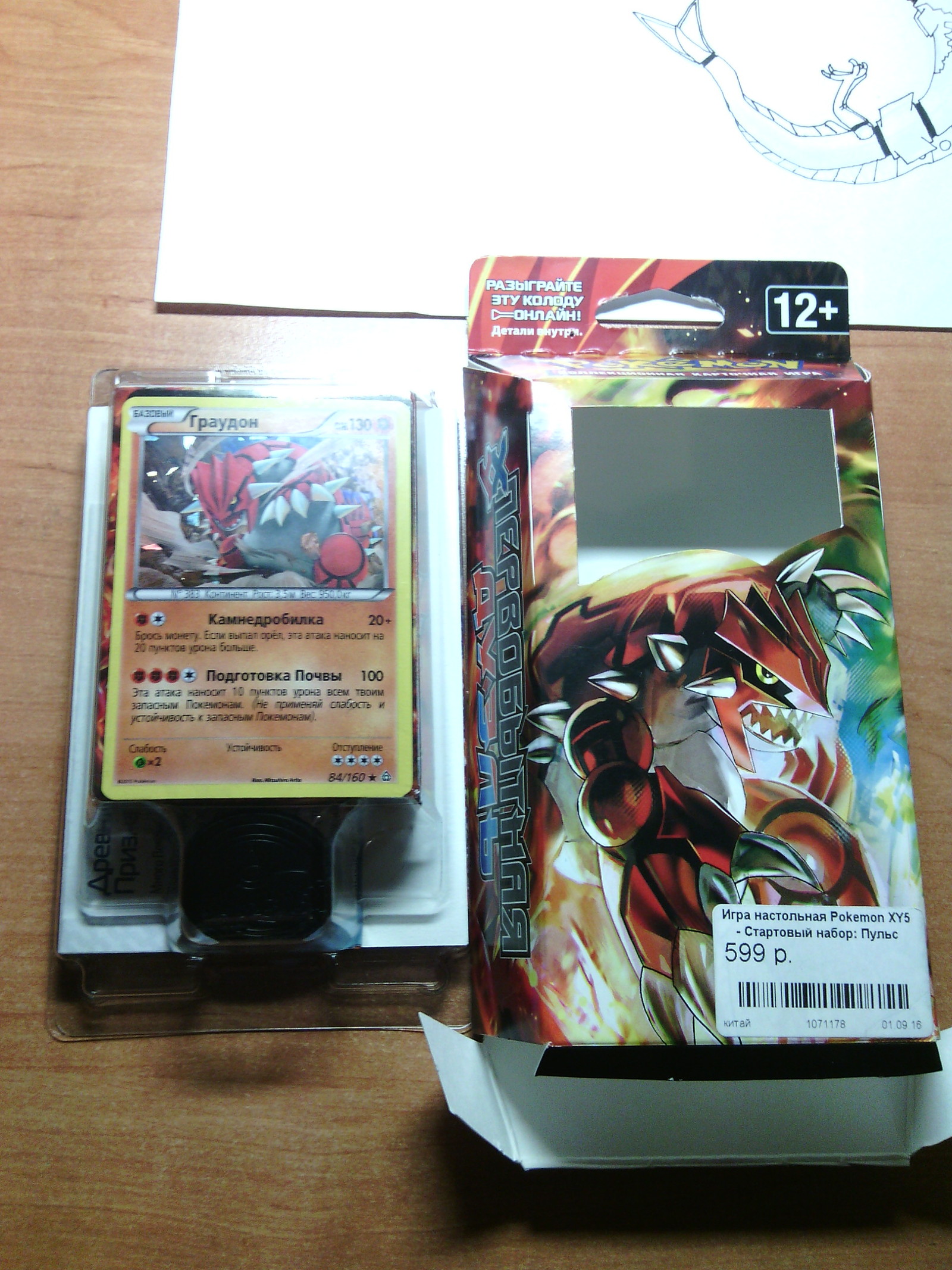 Внутри коробки аккуратный пластиковый блистер, из которого на нас грозно взирает со своей карточки Гроудон. Просьба не обращать внимание на нечто напоминающее рисунок
