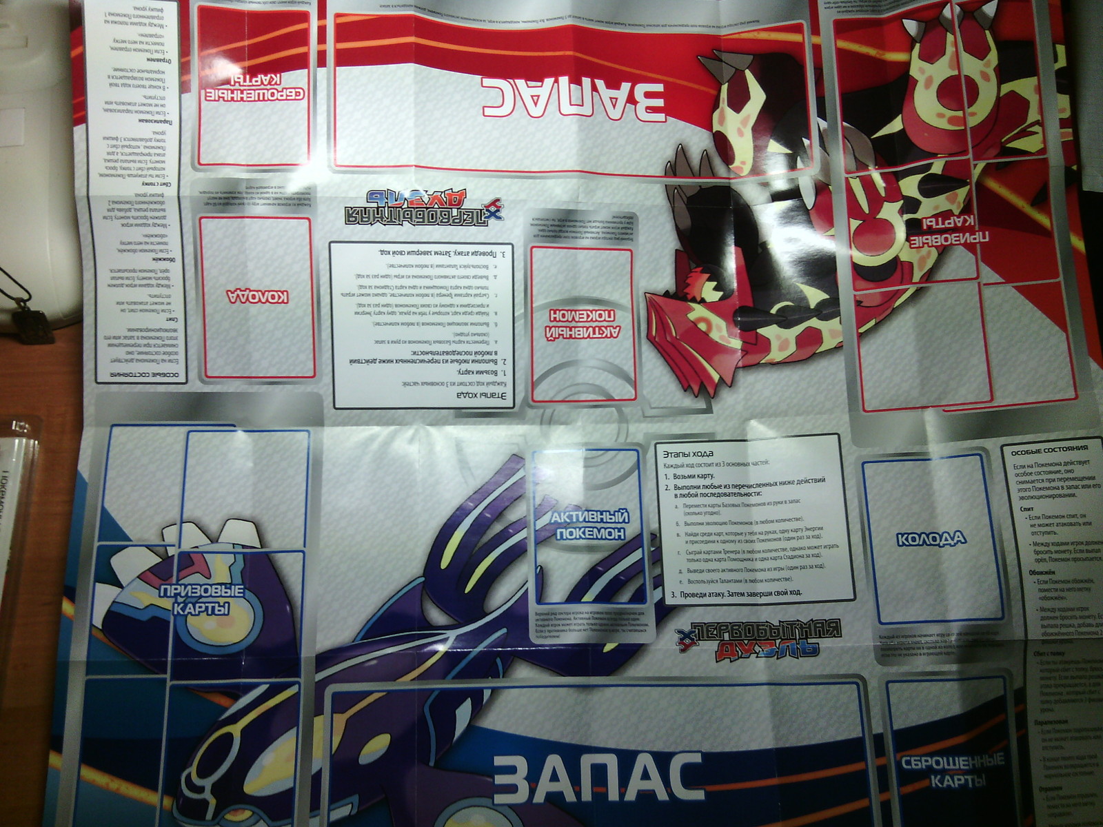 В таких блистерах удобно хранить весь набор. В блистере находятся: поле для игры в сложенном виде, фишки урона (по 10, по 50 и одна 100) вместе с фишками состояний (обожжён, отравлен), бумажка с описанием изменений в ККИ с вводом расширения "Первобытная дуэль" (на обратной стороны есть список карт из этого расширения), карточка с кодом для активации этого набора в онлайн-версии, монета, фойловая карточка с Гроудоном икрасивая коробка с остальной колодой.